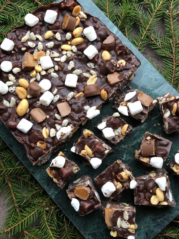 Jag skrev ju tidigare att jag var vansinnigt sugen på rocky road, julgodisets julgodis. Men jag klarar ju aldrig av att göra den enligt originalreceptet utan måste alltid tvista till det lite. Så här blev den i år!