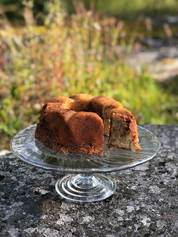 Grädda kakan i nedre delen av ugnen i ca 35 minuter eller tills den är helt genomgräddad, prova med en sticka. Låt svalna ca 15 minuter innan du vänder upp kakan på ett galler eller fat och där kan den svalna klart under formen.