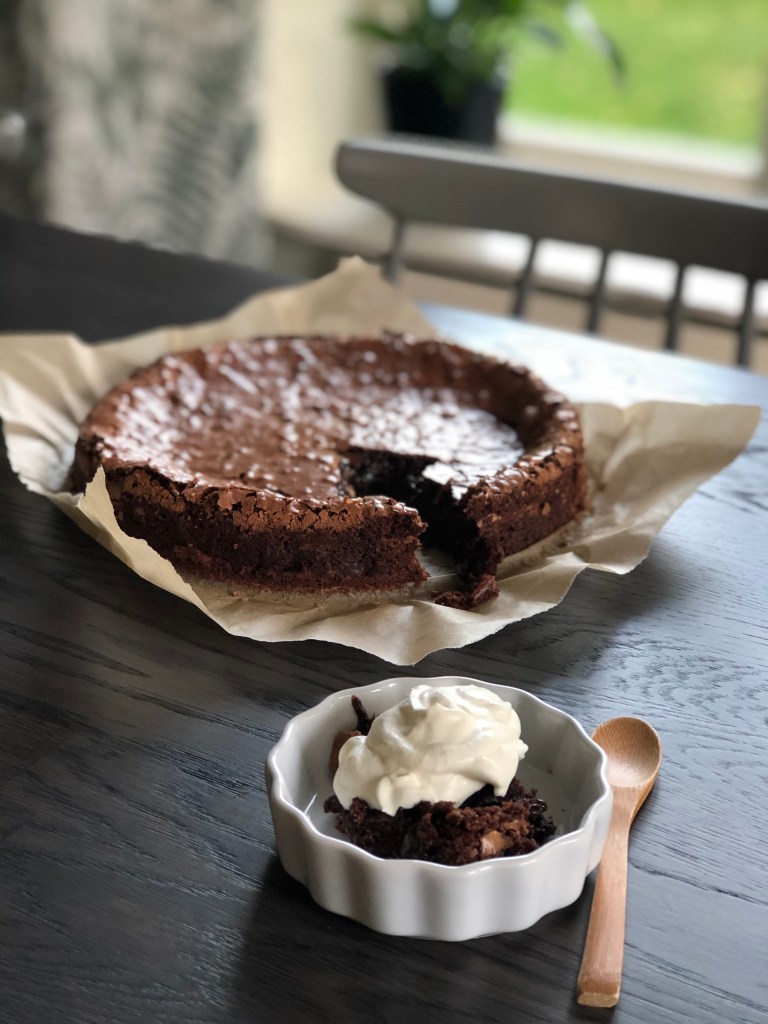 Den här kladdkakan är riktigt nice. Jag har börjat älska kladdkaka när den är nygjord och ljummen framför kall och seg. Dagens recept är från köket.se (Kladdkaka by Louise) men men den ytterst viktiga tillsatsen; salt!