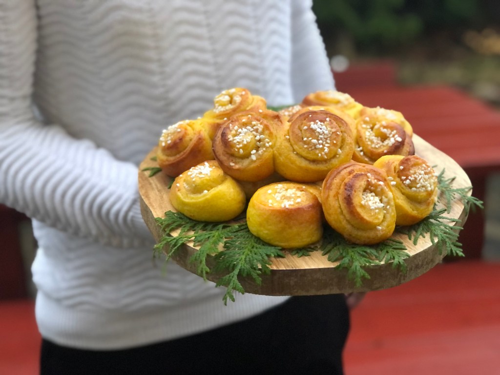 Magiskt goda lussebullar, fyllda med mandelmassa och apelsin.