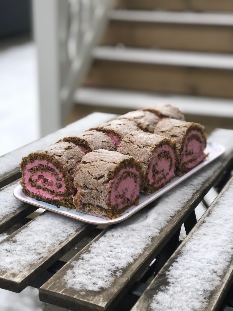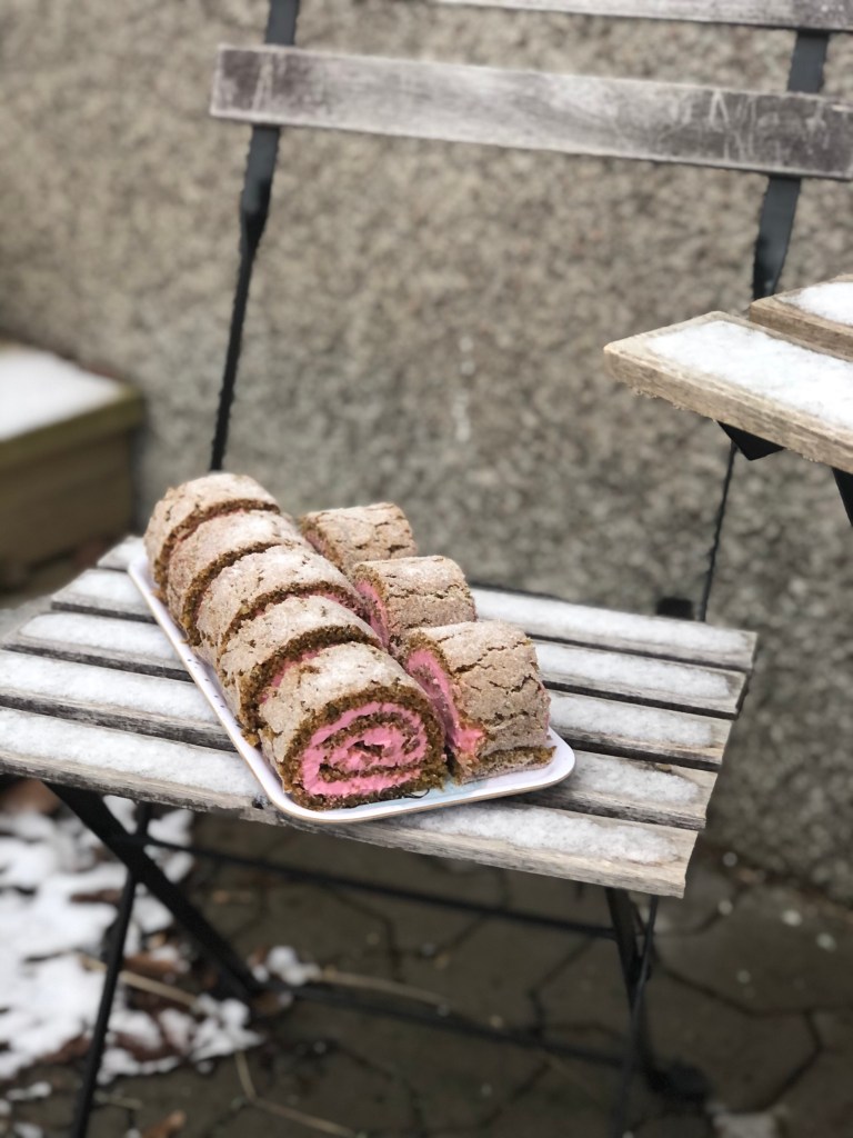 Botten till den här goda rödbetsrulltårtan var intensivt lila när jag skickade in den i ugnen. Ut kom den dock brun, så där sprack min idé om en lilaröd rulle. Men sen slog det mig att frostingen enkelt kunde färgas rosa istället med lite pressad rödbeta. Den här och mycket annat gott förstås, kan man smaka på, på mitt mitt café, café Viktor i Mariehamn. 🙂