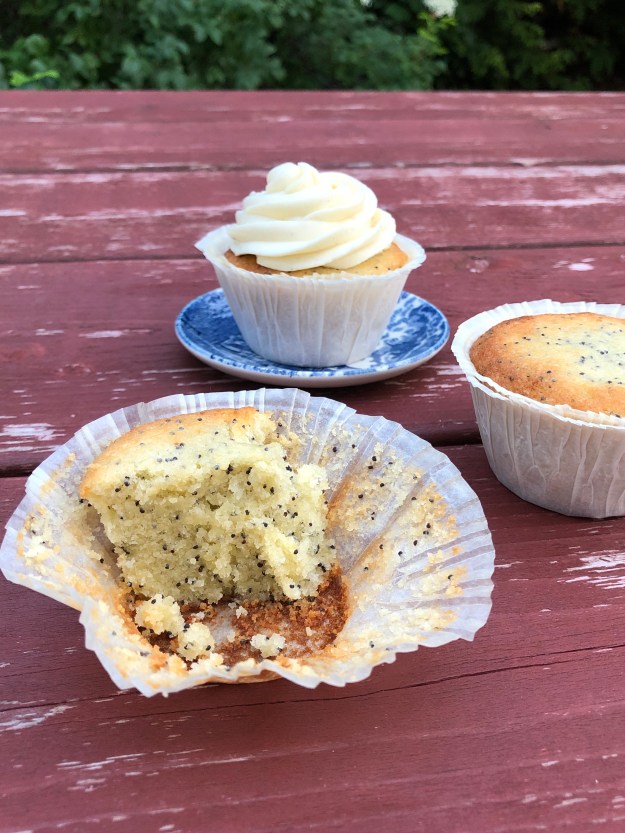 Visp ägg och socker pösigt och blanda ner det smälta smöret. Blanda de torra ingredienserna och vänd ner dem i smeten. Fyll formarna med smeten och stick ner en dumle i varje muffins. Grädda i mitten av ugnen i ca 10 minuter. Låt svalna.
