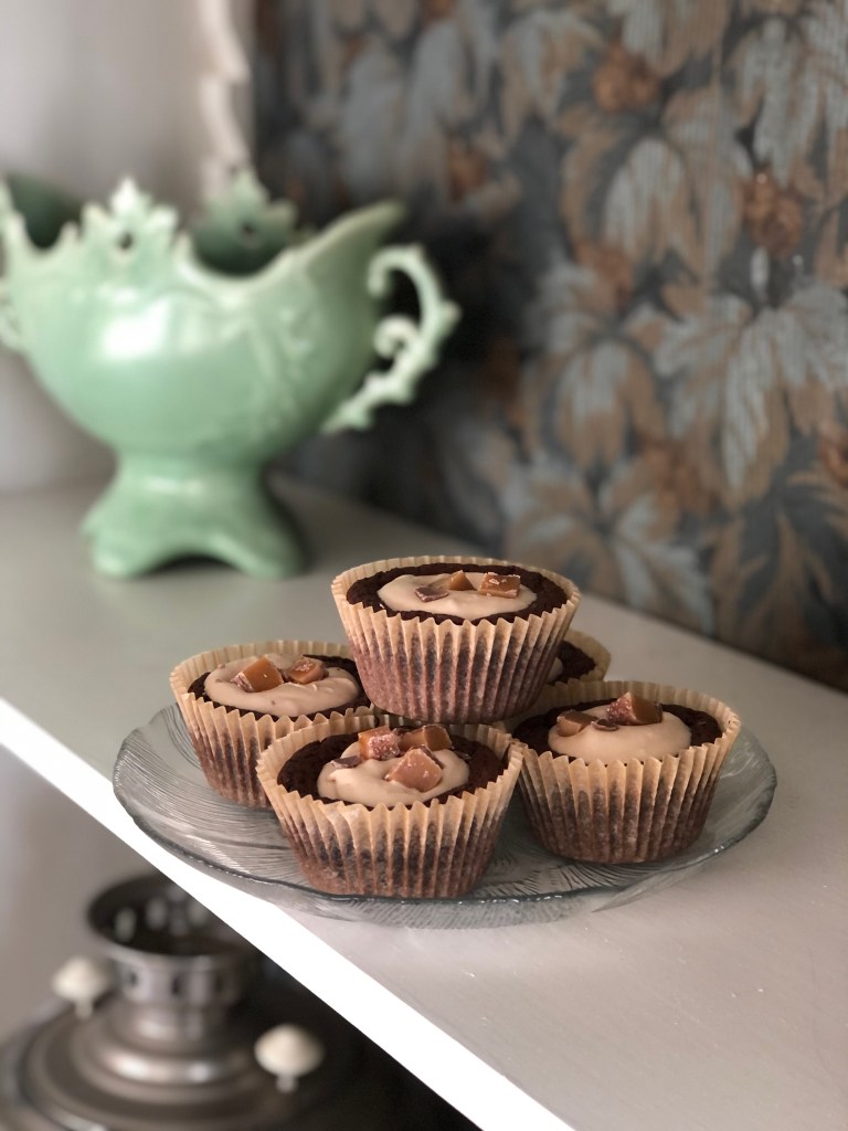 Kladdkaksmuffins fyllda med dumle och serverade med dumlegrädde. En sötsalt godbit med kolasmak. Barnsligt gott!