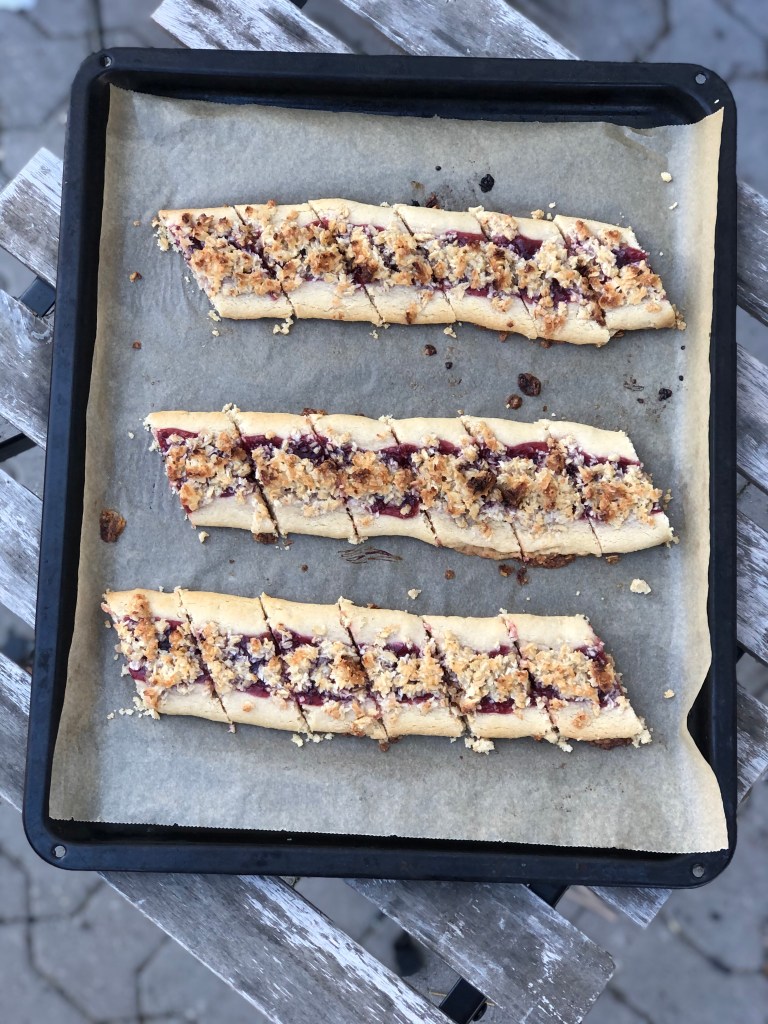 Jag äter ganska sällan just småkakor – men när jag väl slår till vill jag ha dem riktigt goda. Och de blir godare med topping. Dessa är fyllda med hallonsylt och smuldeg med både kokos och havre.