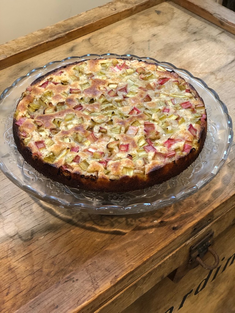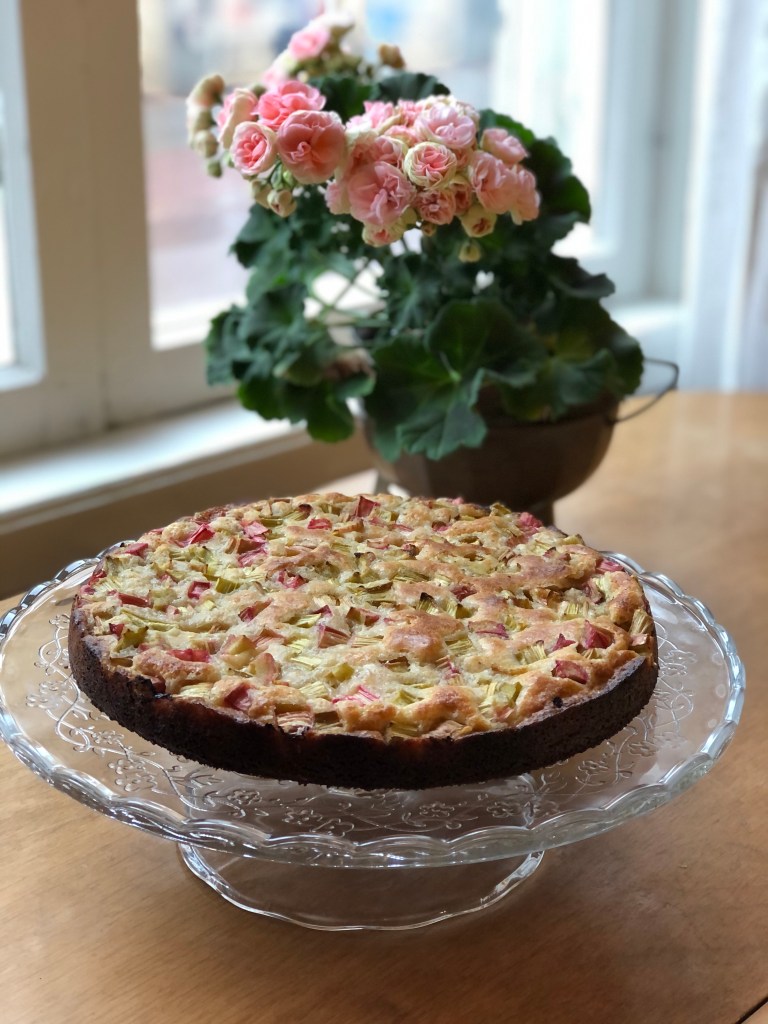 Tärna rabarbern, (den behöver inte skalas) och blanda med potatismjölet. Fördela jämt över smeten och grädda i nedre delen av ugnen i ca 25-30 minuter. Kakan är klar när den känns fast men har ett litet gung kvar i konsistensen. Låt svalna lite och servera lätt ljummen, rumstempererad el ställ i kylen och servera den kall.