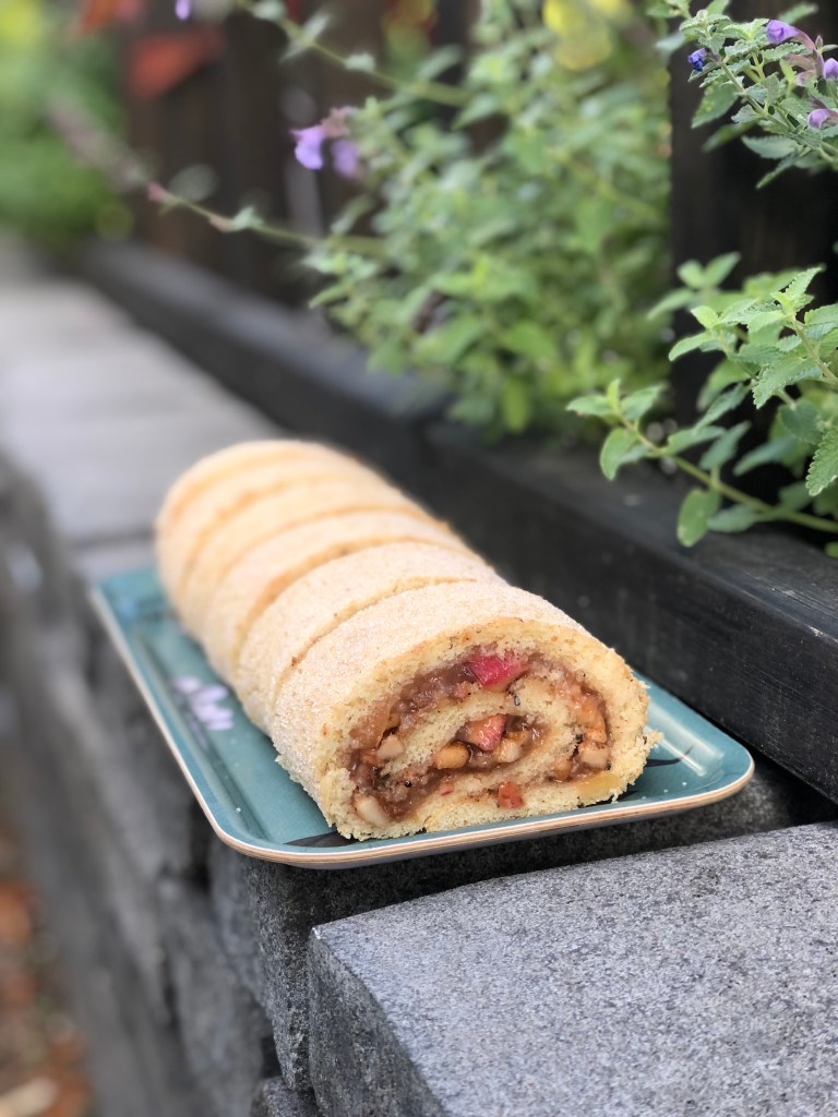 En magiskt god rulltårta med mycket äppelsmak. Den är nämligen fylld med både hemkokt äppelmos och kryddstekta äppelbitar. Den blir riktigt festlig om du serverar vaniljkräm, grädde el vaniljglass till.