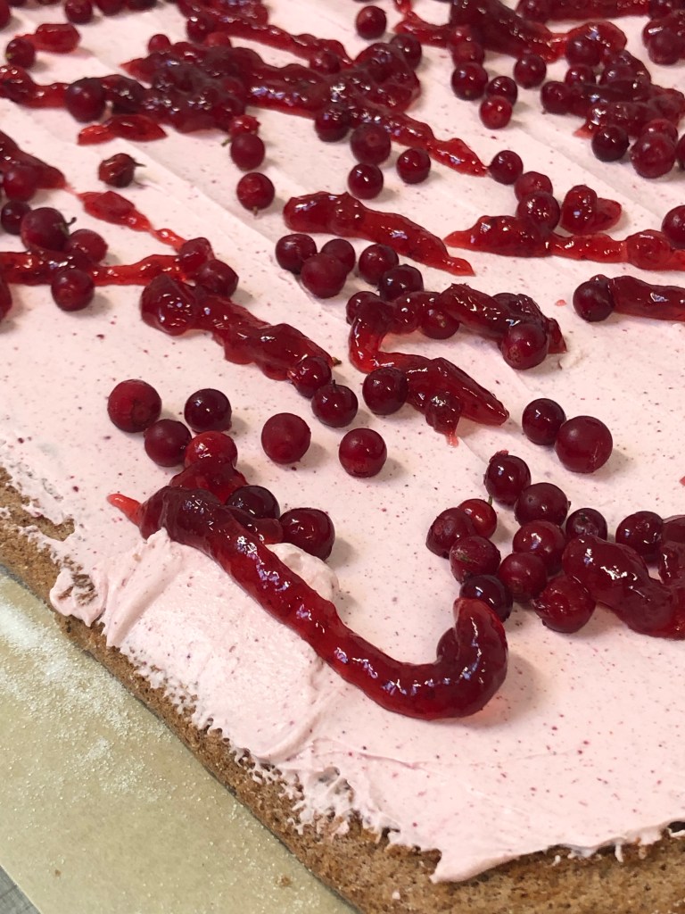 Ni vet ju att det är viktigt för mig att det SMAKAR mycket. Därför använder jag mig av lingonpulver, lingon och lingonsylt – som även bidrar med gott ”kladd” – i fyllningen. Lingonpulver var dock inte så lätt att hitta på Åland, så det har jag köpt i Sverige. Men man kan också utesluta det och bara ösa på med extra många lingon istället.