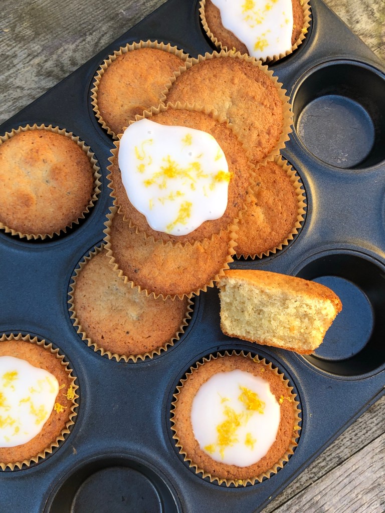Rör ihop en trögflytande glasyr av florsocker och pressad citron och klicka ut över muffinsen. Toppa med rivet citronskal.