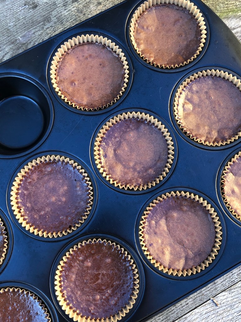 Den här satsen delade jag upp på 12 muffins och en mindre kaka på 20 cm. Kakan ovanför är bakad utan vattenbad vilket bara påverkar utseendet.