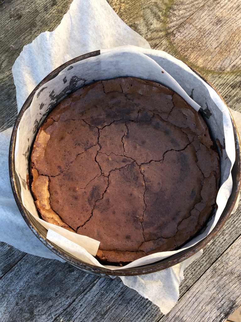 OBS! Egentligen ska den här kakan bakas i en springform med avtagbara kanter och gräddas i ett vattenbad. Kontrollera först att din form inte läcker in vatten. Mina gör det, därför skippar jag vattenbadet – och det går utmärkt. Kanske har du däremot en ugnsform med lagom höga kanter som du kan klä med bakplåtspapper och grädda kakan i.