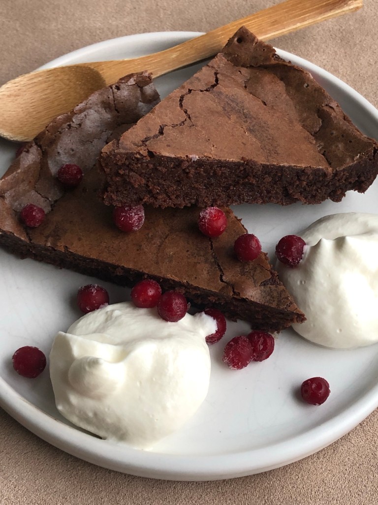 Tänk dig en kaka som har en konsistens av bakad mousse, krämig tryffel el ett chokladsmör som bara smälter i munnen. Där har du konsistensen. Smaken är bland det godaste i chokladväg, jag lovar! Som en superbonus är den fri från mjöl och därav naturligt glutenfri. Supergod med vispgrädde, glass el vispad vanilj crème fraîche.