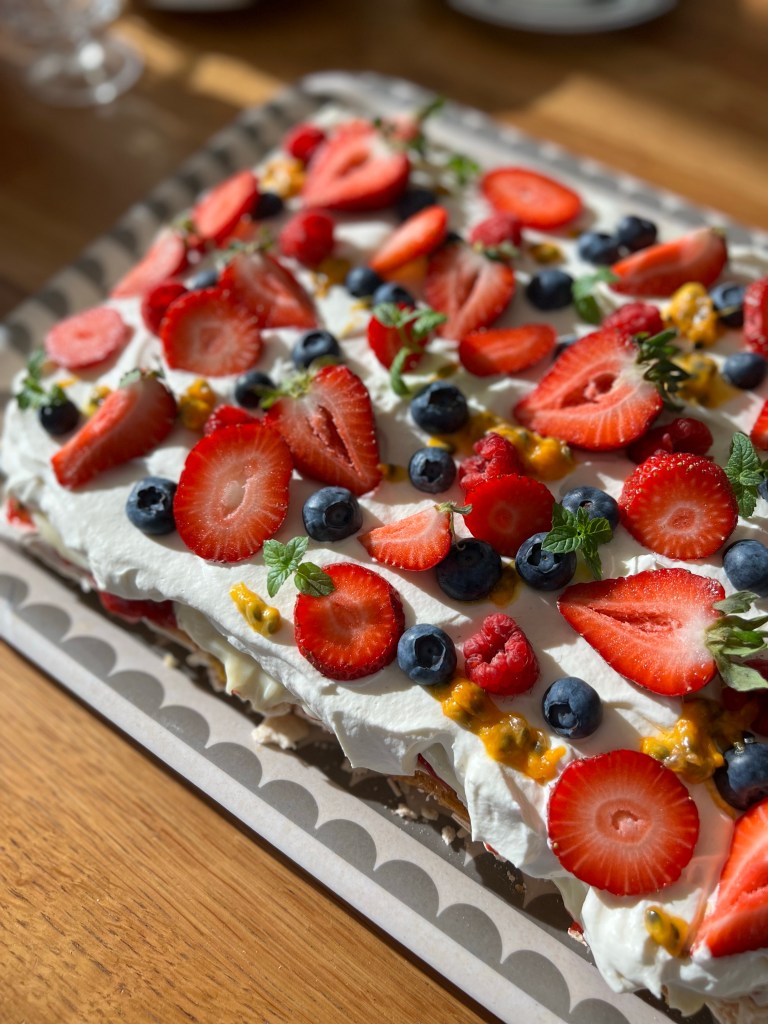 Så himla god tårta! Saftig botten med mjuk maräng, syrlig kräm, rund vaniljkräm, grädde och bär. En drömmig kombo som älskas av stora som små.