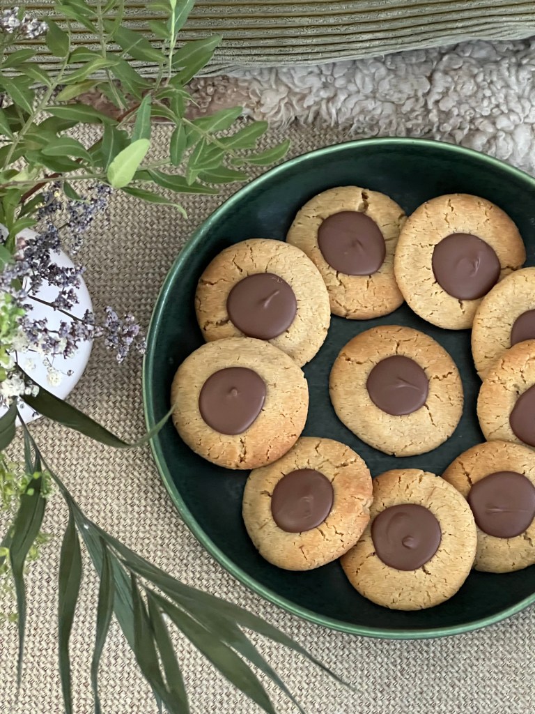 Arbeta samman ingredienserna till kakorna tills du har en deg. Rulla små bollar av degen, lägg dem på plåtar med bakplåtspapper och tryck till bollen lite lätt så det formas en liten grop. Grädda i ca 7 minuter el tills kakorna har lite färg i kanterna. Låt svalna.