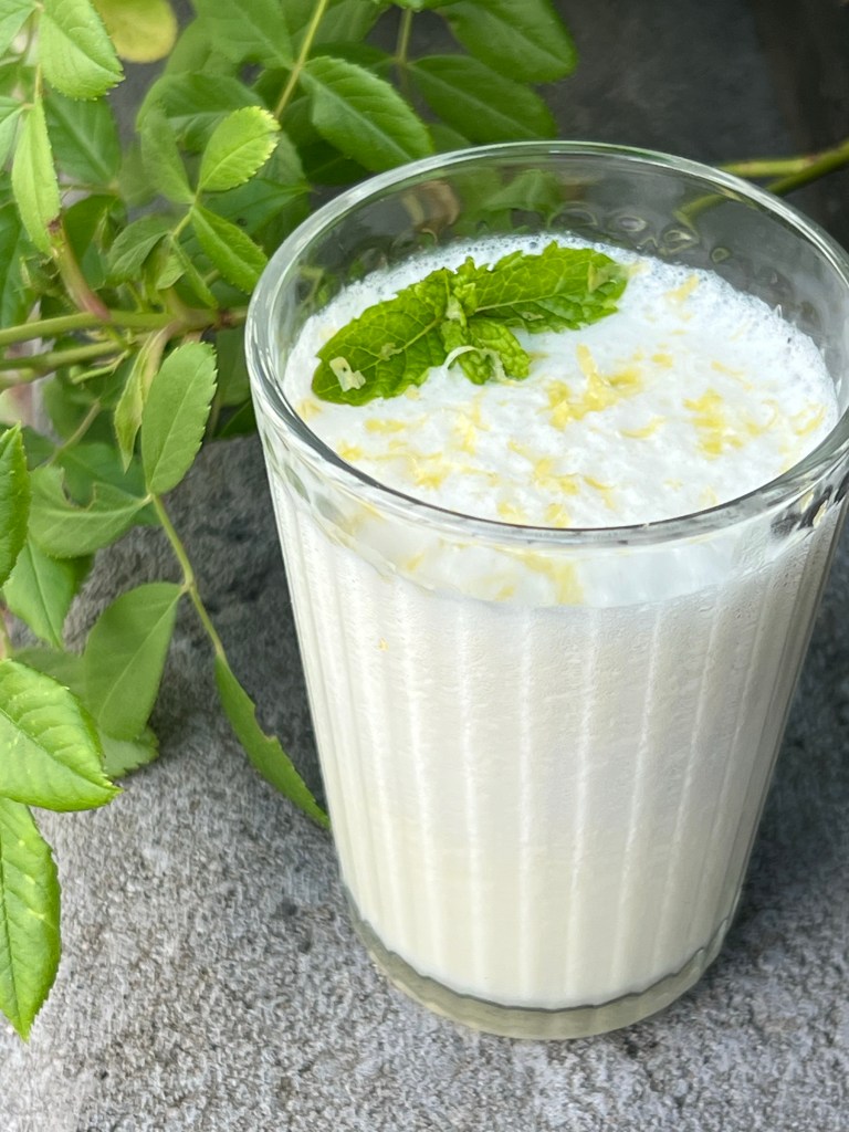 Syrligt läskande lemonad med mjölkiga toner. Skummig och lite tjockare i konsistensen. En ny sommarfavorit! Citron kan ersättas med lime el så blandar man, det blir också gott. Vill du busa till det så tillsätt citronmeliss el mynta också.