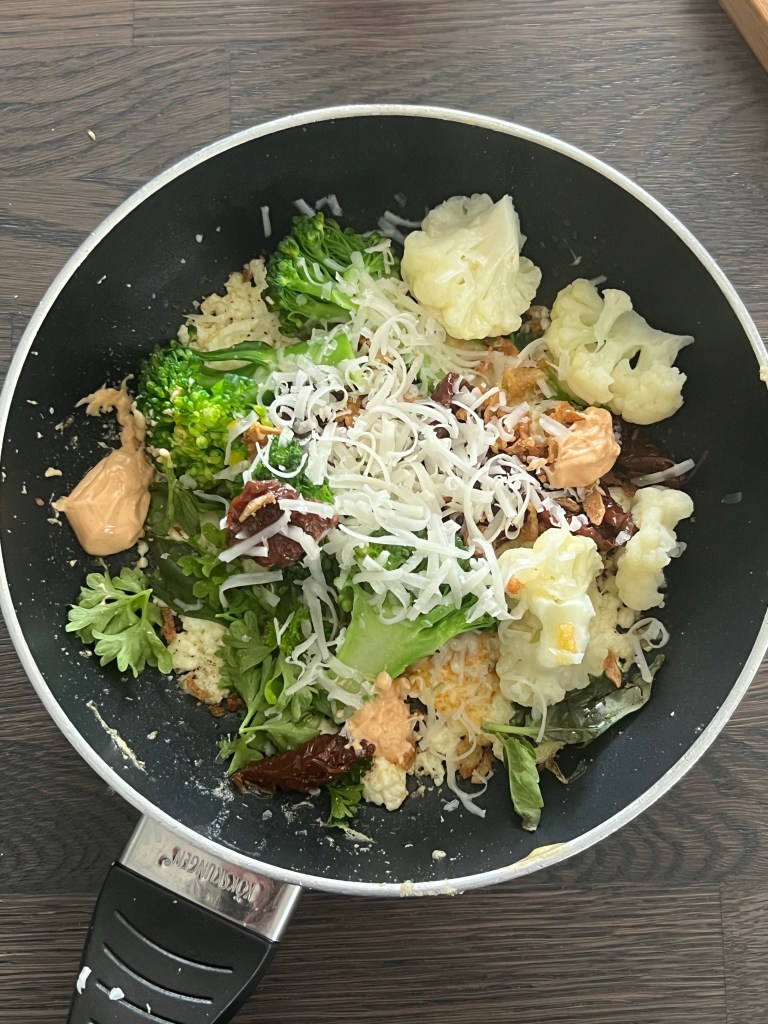 Smält smör/olja i en liten stekpanna. Smula ut 25-50 g fetaost i ytterkanten av pannan. Knäck ner ett ägg i mitten och låt fräsa en stund. Krydda. Ge några broccoli- och blomkålsbuketter ett snabbt uppkok, häll av vattnet och toppa ”omeletten” med grönsakerna samt annat som du gillar, exempelvis soltorkad tomat, valfri lök, riven getost el parmesan samt srirachamajo och färska örter.