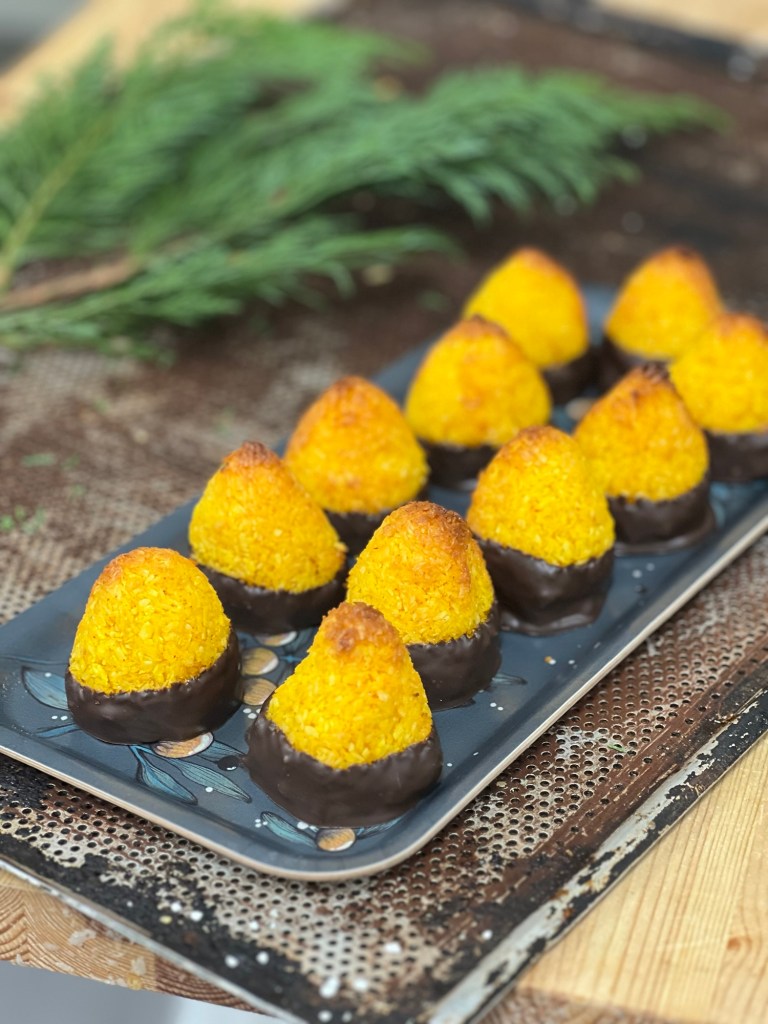 Kokostoppar med saffran, apelsin och choklad