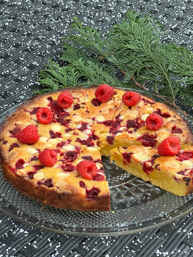 Häll smeten i formen. Toppa med hallon och vita chokladknappar.