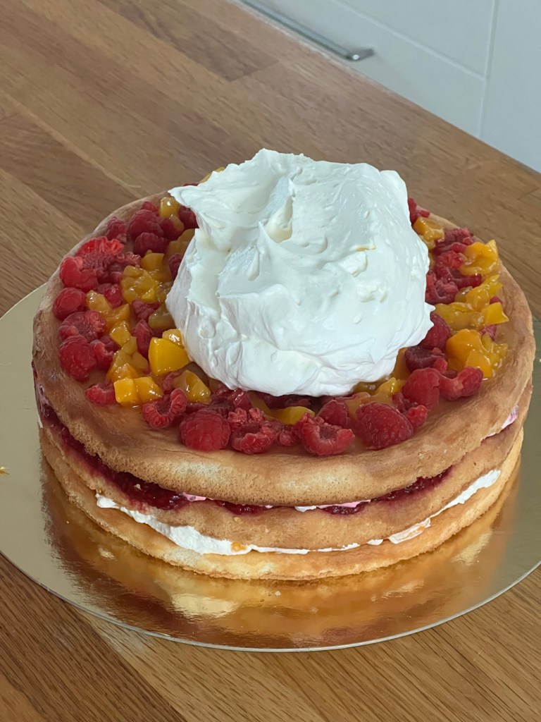 Smält smöret till kakan och blanda med resten av ingredienserna. Häll smeten i formen och grädda i mitten av ugnen i 18-20 minuter, el tills den precis stannat. Ta ut kakan. Höj ugnsvärmen till 200-225 grader. Gör toscan medan kakan är i ugnen.