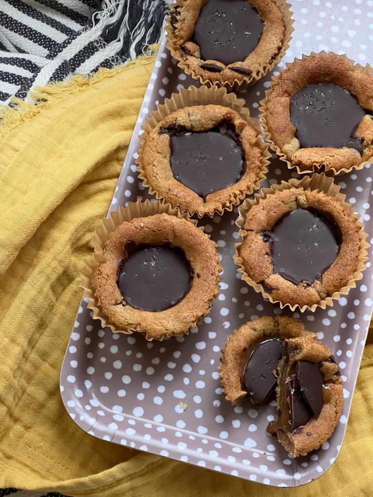 Grädda i mitten av ugnen i 8-9 minuter el tills de fått fin färg. Låt svalna en aning och om de inte redan sjunkit ner lite i mitten så gör en grop med ett matskedsmått. Låt svalna helt.