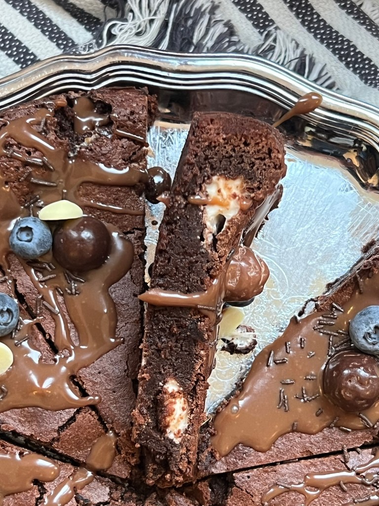 Fyll gropen med kinuskisås och toppa med smält choklad. Låt den sätta sig en stund och toppa sedan med lite flingsalt. Ställ ev kakorna i kylen för att stelna.