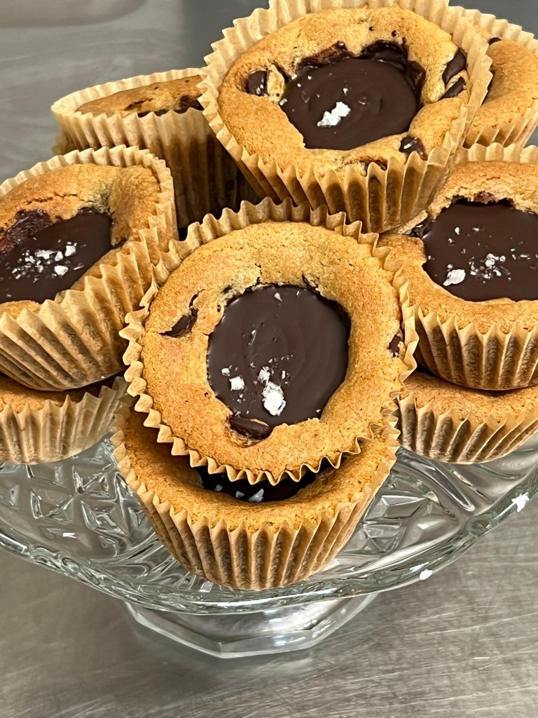Vispa samman smör med allt socker, sirap och salt, gärna i en köksmaskin med vingen isatt. Addera ägget och vänd sedan ner allt mjöl blandat med bakpulver och bikarbonat. Vänd sist ner chokladen. Ställ degen i kylen 30-60 min (el längre, över natten för fylligare smak). Forma 12 bollar (ca 60 g st) och tryck ner dem lätt i formarna.