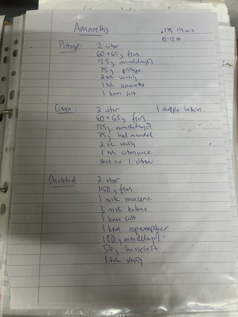 Så här kan mina recept se ut i min receptpärm på mitt café. (Ett av de tydligare recepten!!) Inte en människa förutom jag ser vad det står, jag har en fruktansvärd handstil och så skriver jag snabbt dessutom och använder förkortningar och sällan förklaringar. 😅 Det är en jäkla tur att jag har den här bloggen så det blir lite ordning och reda.