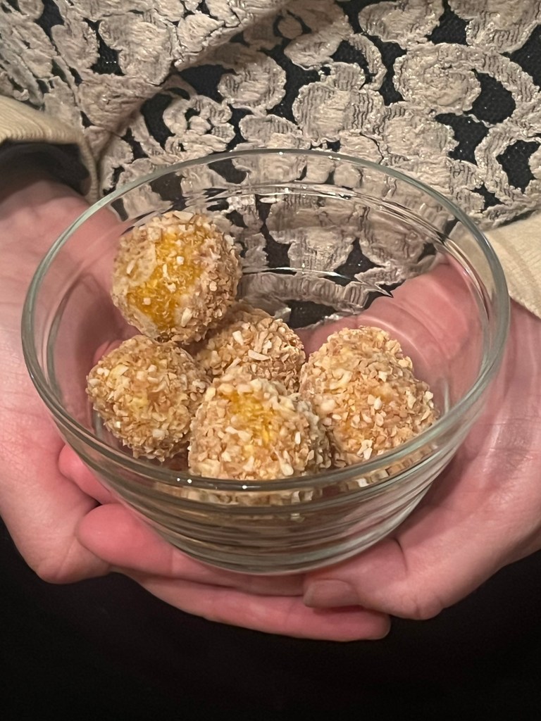 Låt stelna i kylen 1 timme. Rulla bollarna först i ett tunt lager smält vit choklad och sedan i rostad kokos.