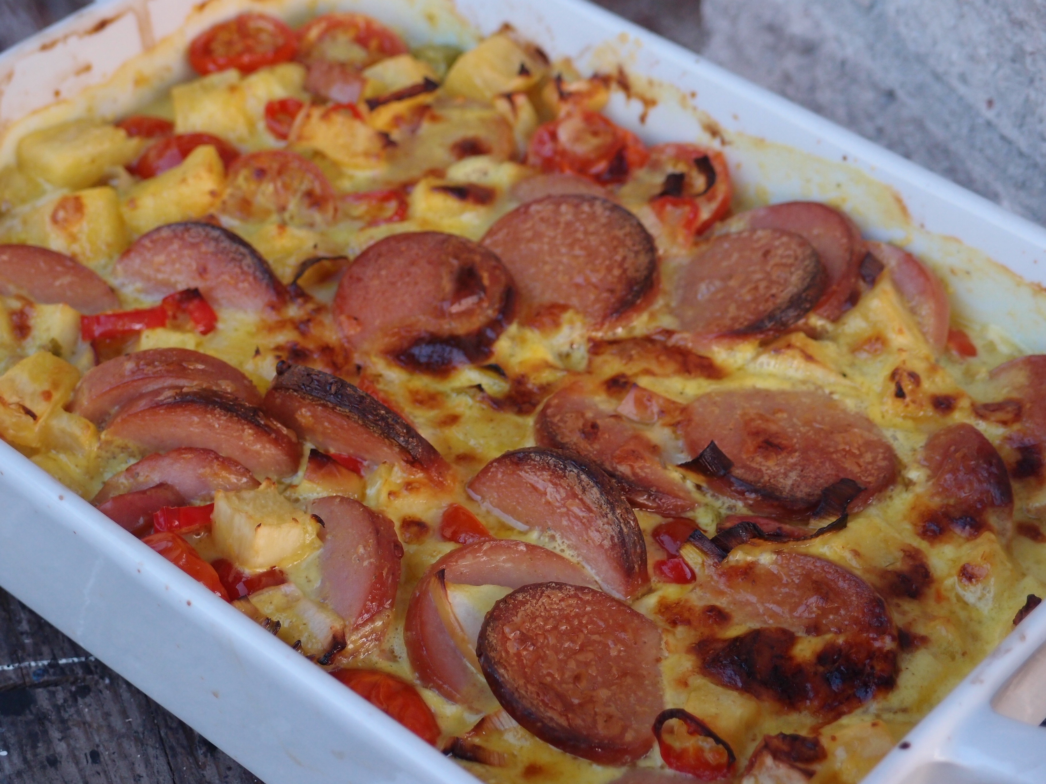 Currysås är inte bara gott med kyckling, prova det med korv! Här samsas korvslantarna med purjolök, äpple, ananas, ost, tomat och färsk chili – för den som önskar hetta. En enkel men väldigt god vardagsrätt för hela familjen.