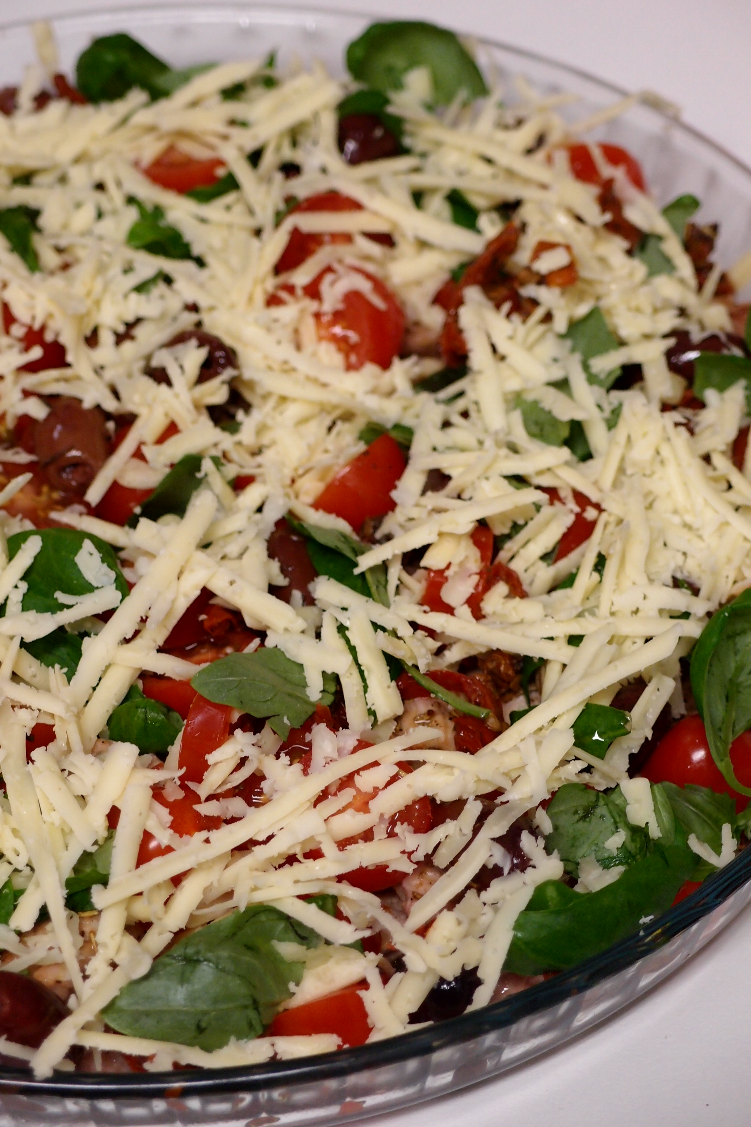 Brynta skivor av fläskfilé toppas med tomater, oliver, basilika, vitlök och riven ost och gratineras slutligen i ugnen.