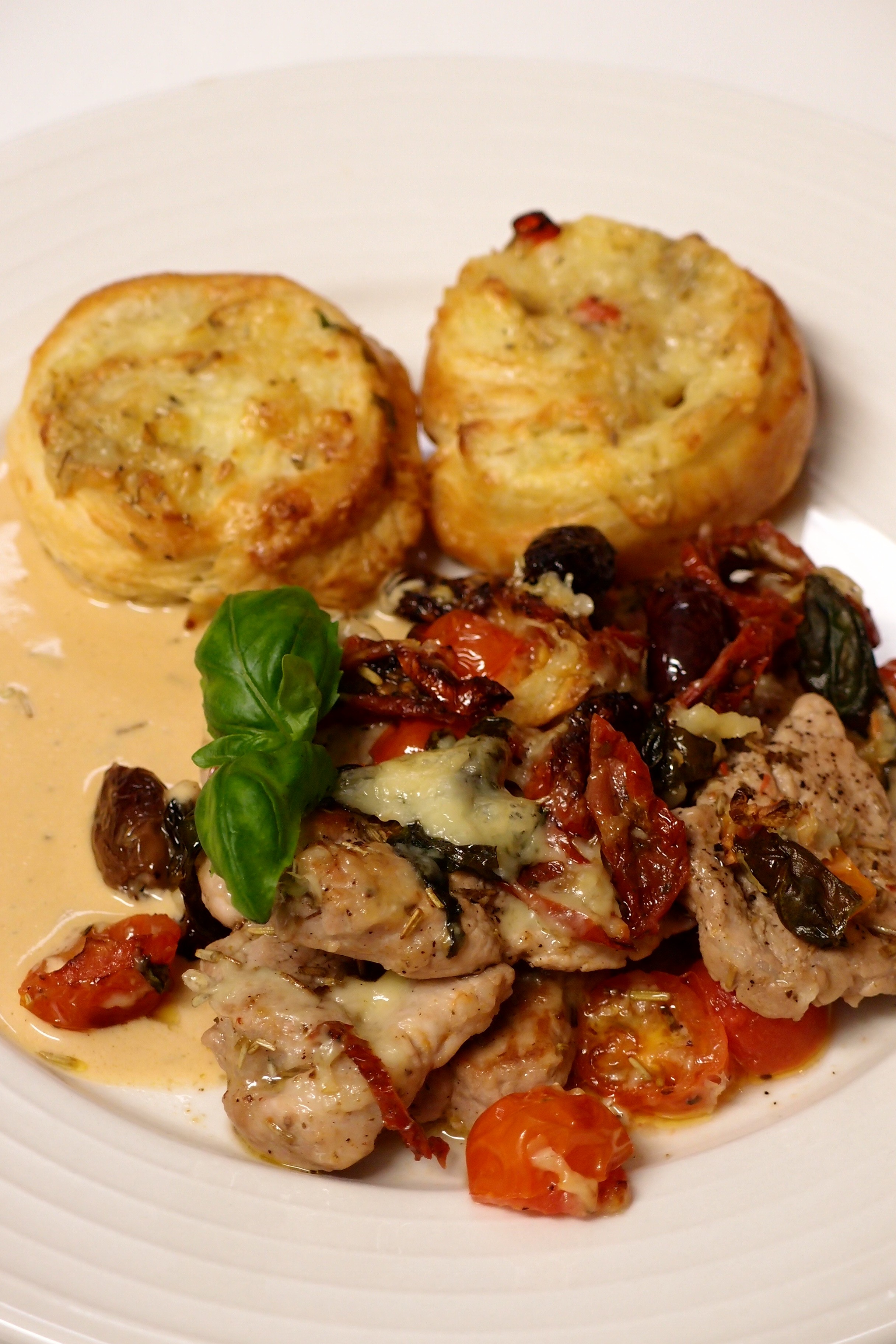 Putsa filén från hinnor och skär den i ca 0,5 cm tjocka skivor. Bryn dem hastigt i smör i en het stekpanna. Krydda med salt, peppar och rosmarin. Lägg bitarna i en ugnsform. (Stekpannan behöver inte diskas ur, spara den till såsen). Toppa köttet med tomater, soltorkade tomater, oliver, riven basilika, vitlök och riven ost. Gratinera i mitten av ugnen på 200-225° i ca 15-20 minuter.