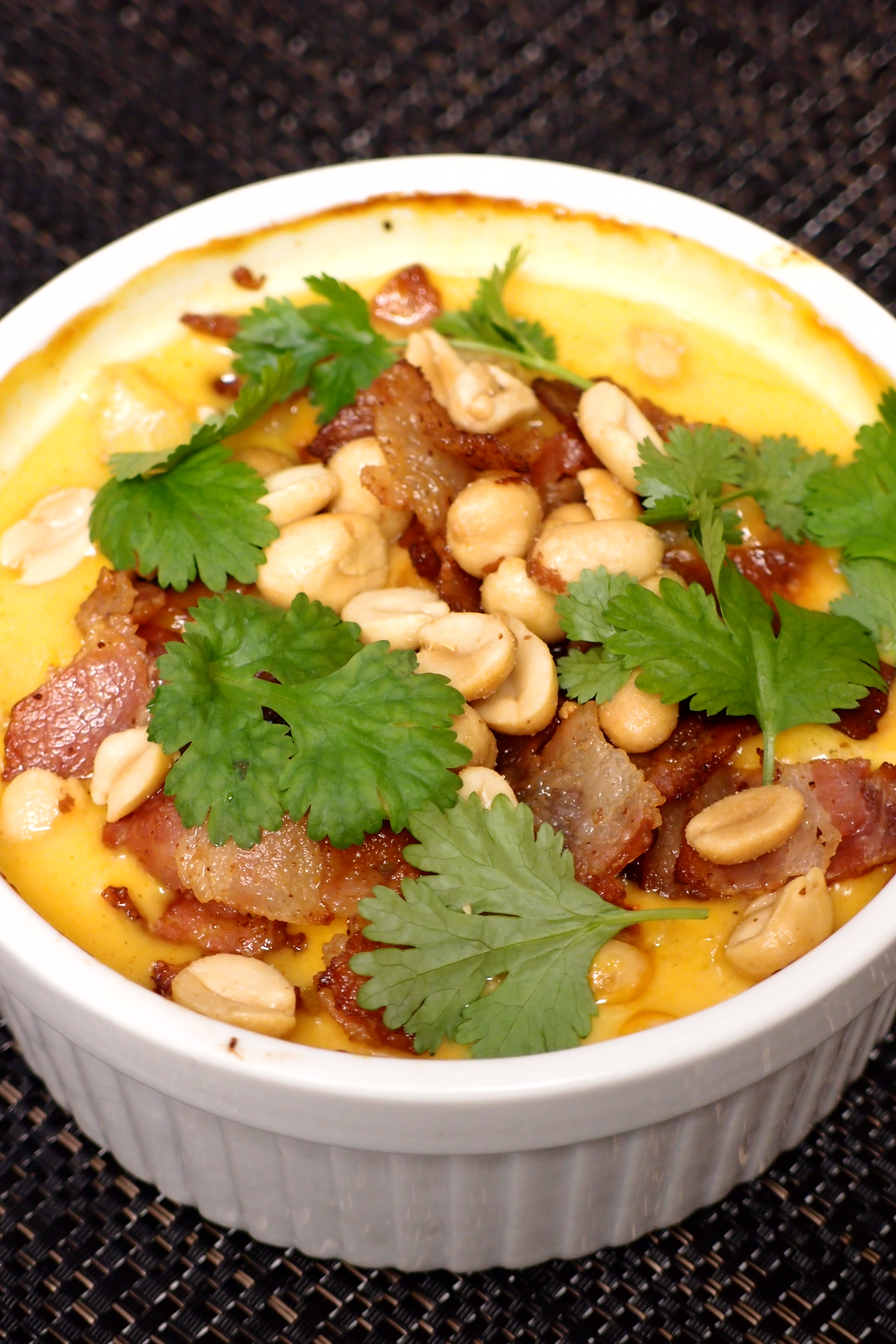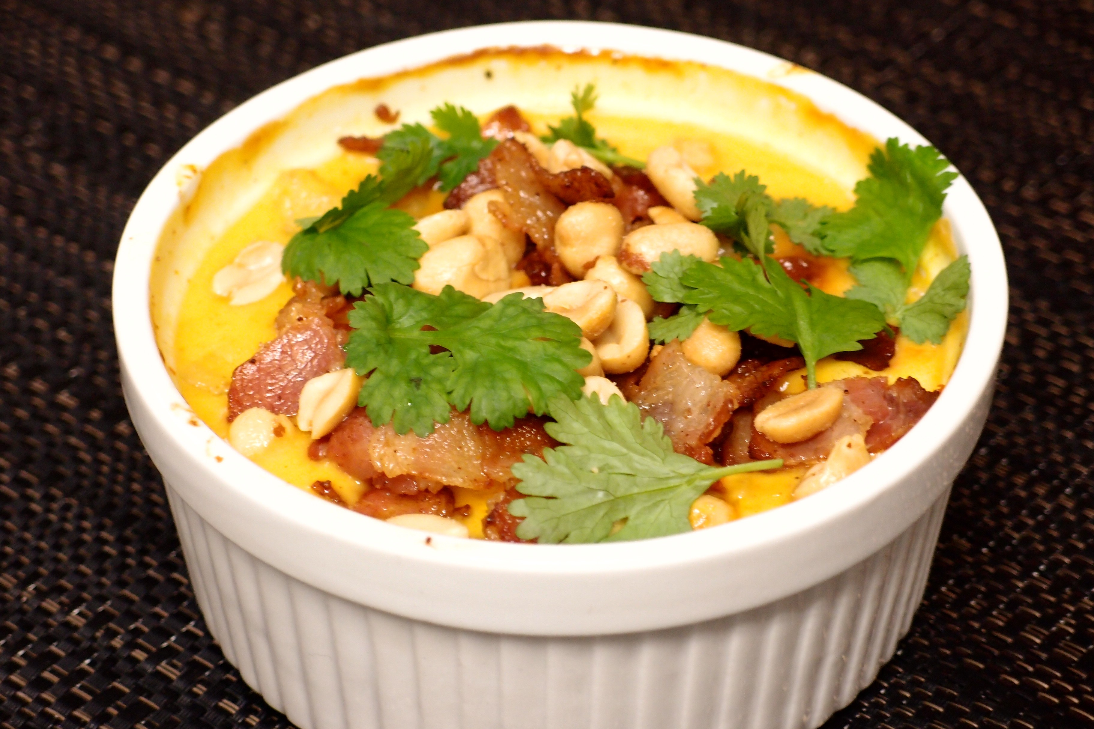 Toppa rätten med bacon, salta jordnötter och färsk koriander och servera med jasminris och limeklyftor.