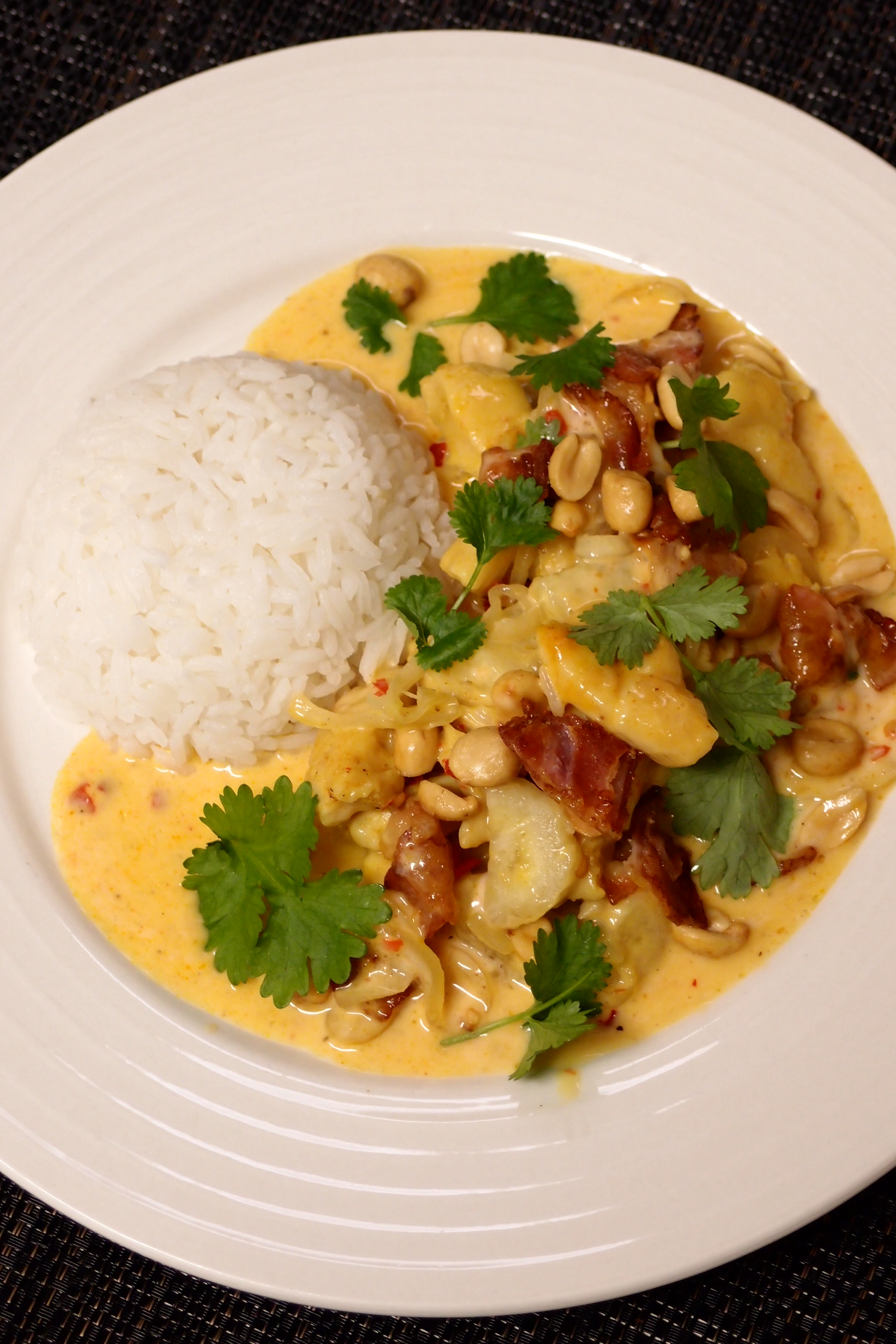 Servera gärna med klibbigt jasminris som enkelt suger upp den goda såsen. Min flygande Jakob är en kycklingrätt med söt banan och lök i en god och gräddig chili-currysås. Det hela toppas med salta bitar av bacon och jordnötter och får en frisk avslutning med färsk koriander och pressad limesaft.
