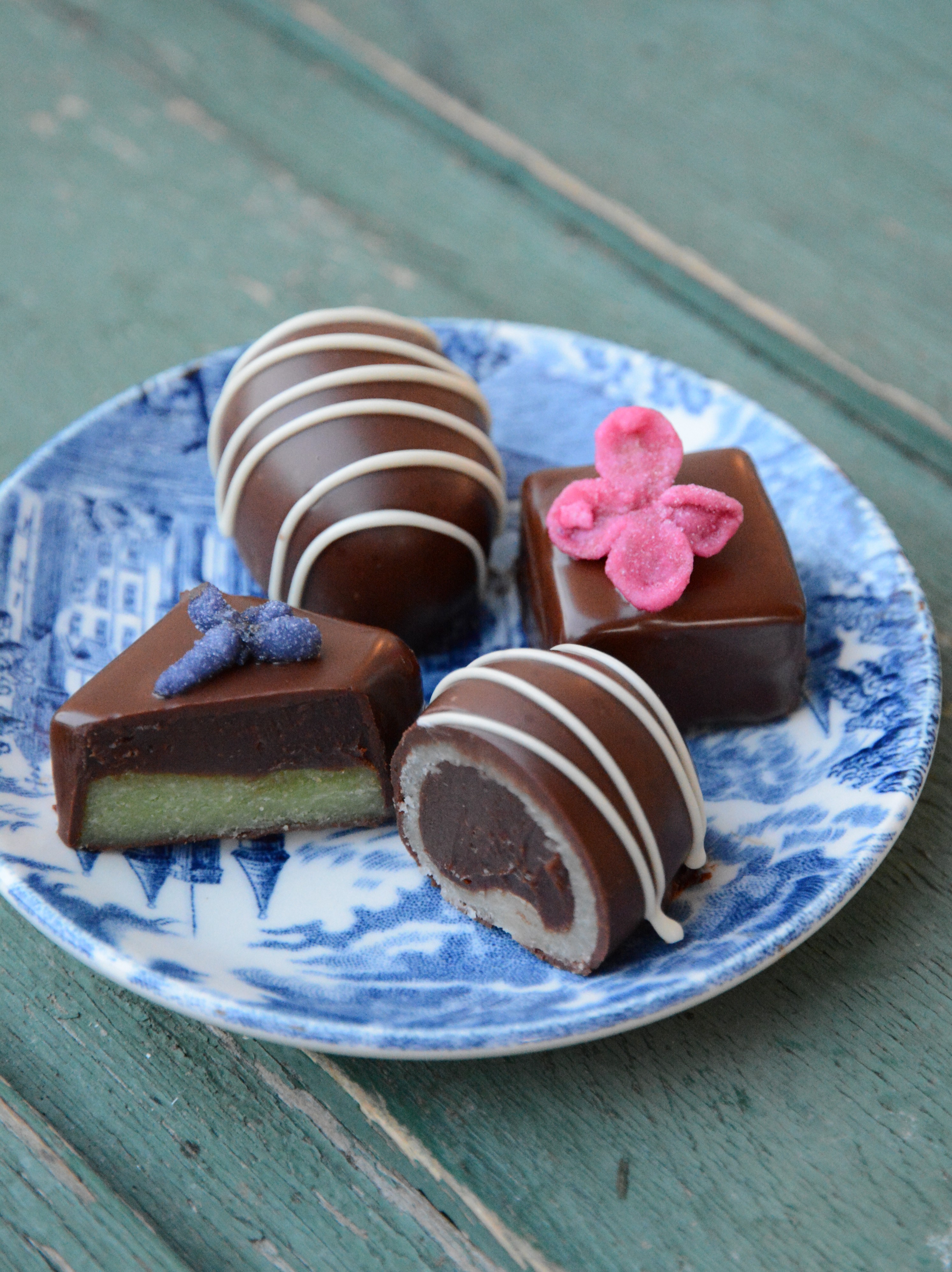 -små tvådelade praliner med en botten av färgad mandelmassa, toppade med tryffel och garnerade med kanderade violer, kanderade syrener och nonstop.