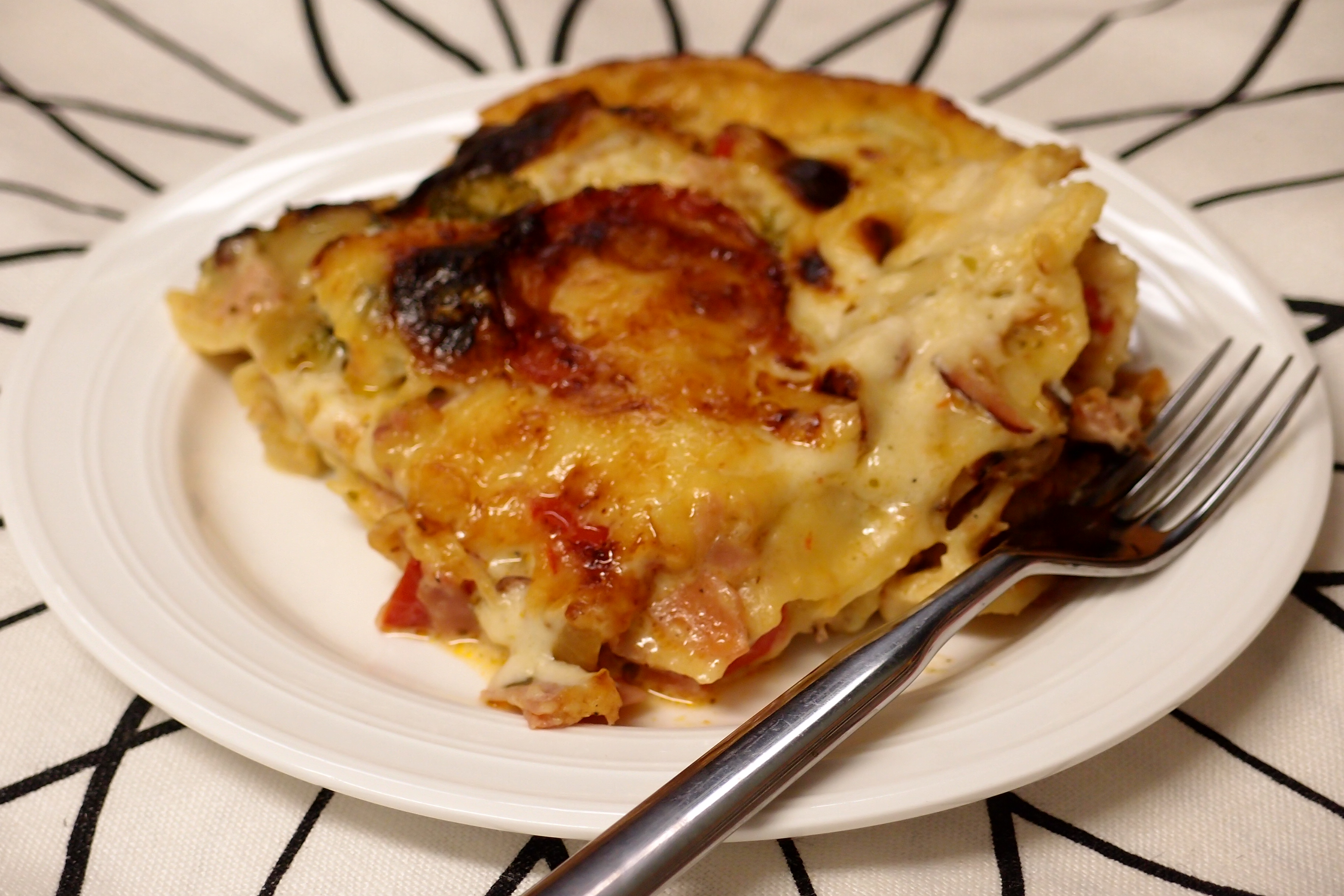 Lasagne är enkelt att variera, här är den smaksatt med skinka, bacon och grönsaker framför den traditionella köttfärssåsen med tomatkross. Självklart går det bra att använda det också, räkna då med 500 g köttfärs, 1 lök, några rivna morötter och en burk krossad tomat och glöm inte att krydda ordentligt!