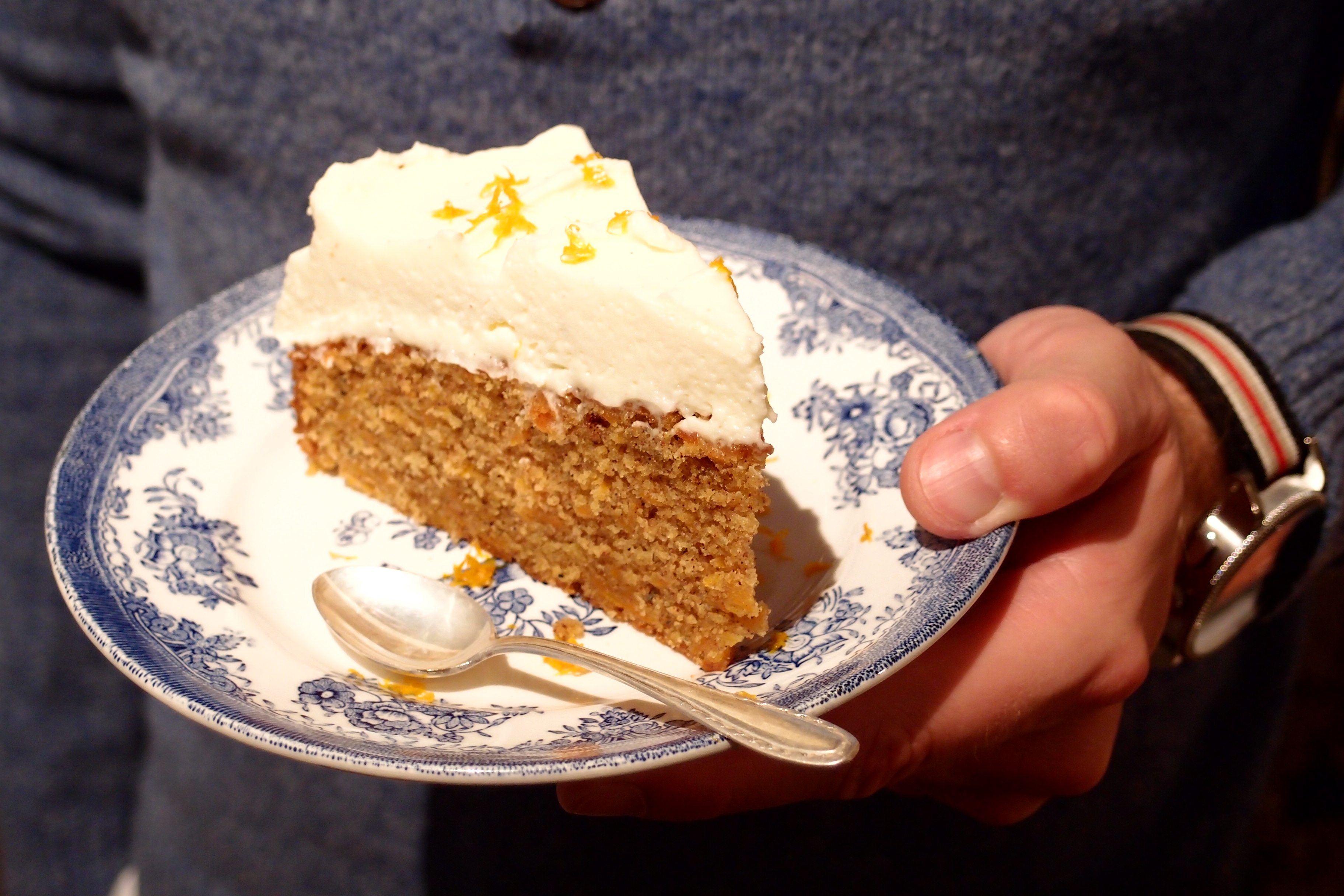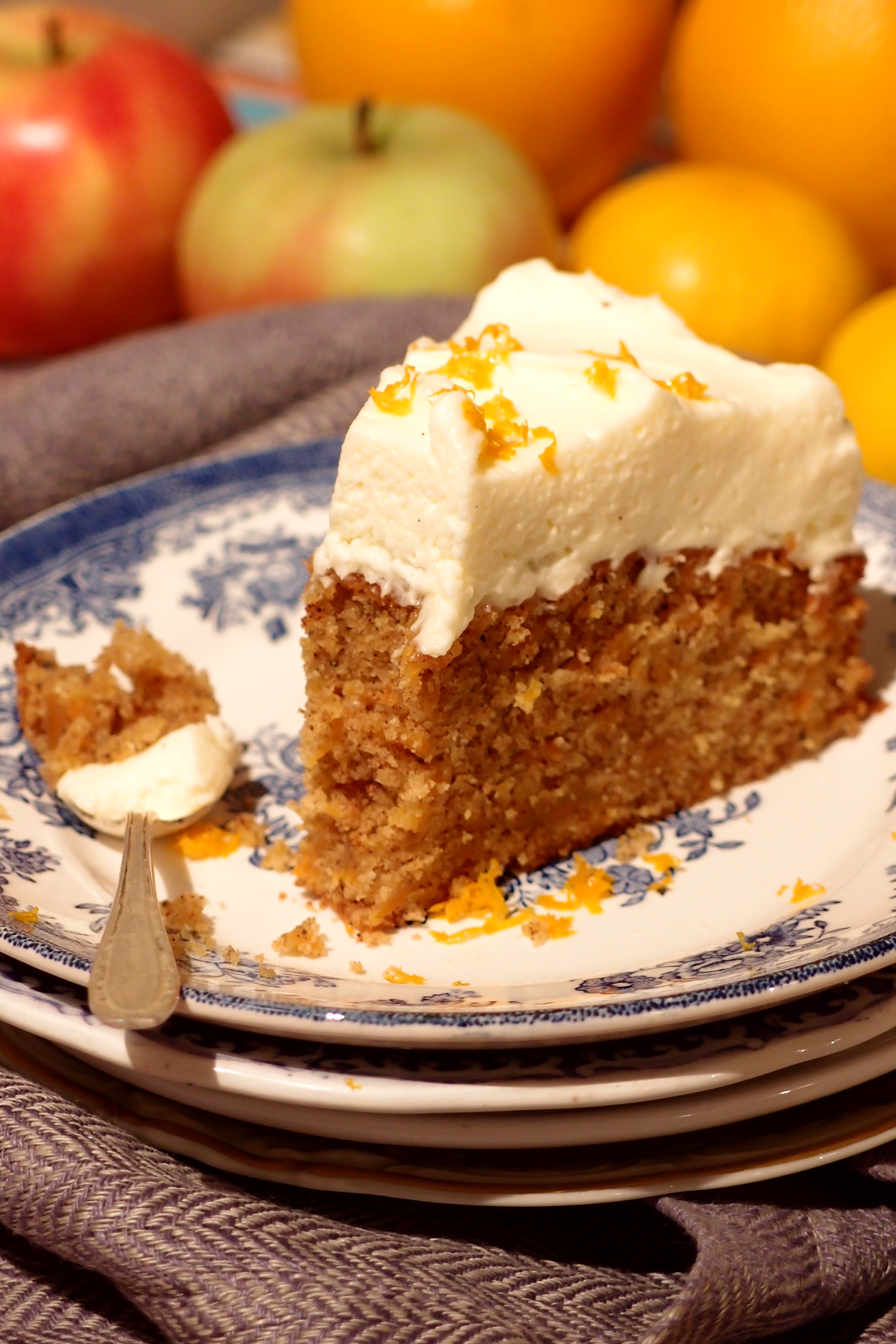 Botten är saftig, kryddig och ganska tung och toppingen gräddigt len och luftig. Jag tycker apelsin kompletterar både morötter och kryddor på ett uppfriskande sätt men den kan lämnas bort eller ersättas med lime eller citron också.