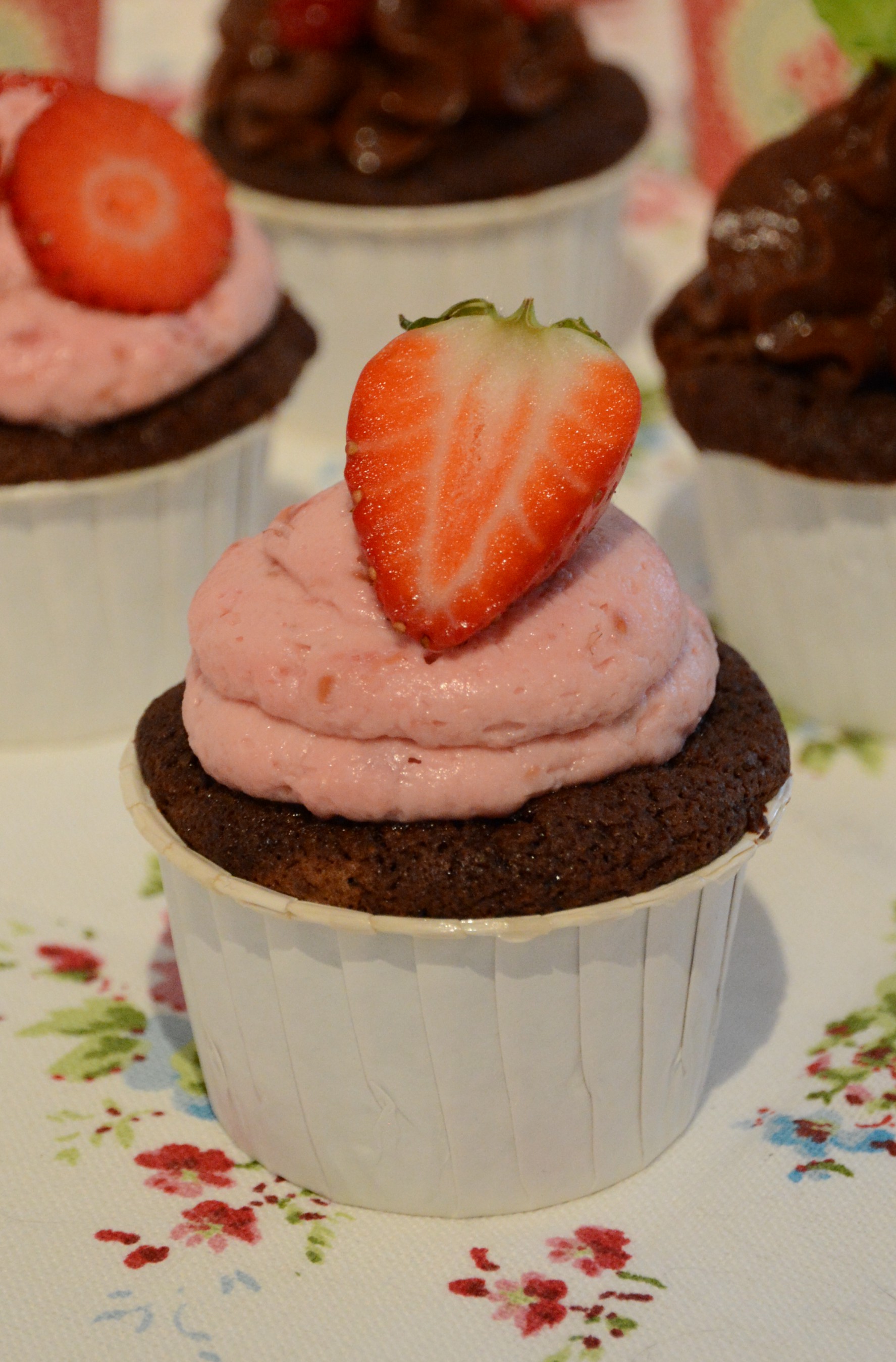Jag kunde inte välja vilken frosting som var godast, därför bjuder jag på två varianter; en frisk och luftig hallonfrosting och en mäktigt krämig Nutellafrosting.