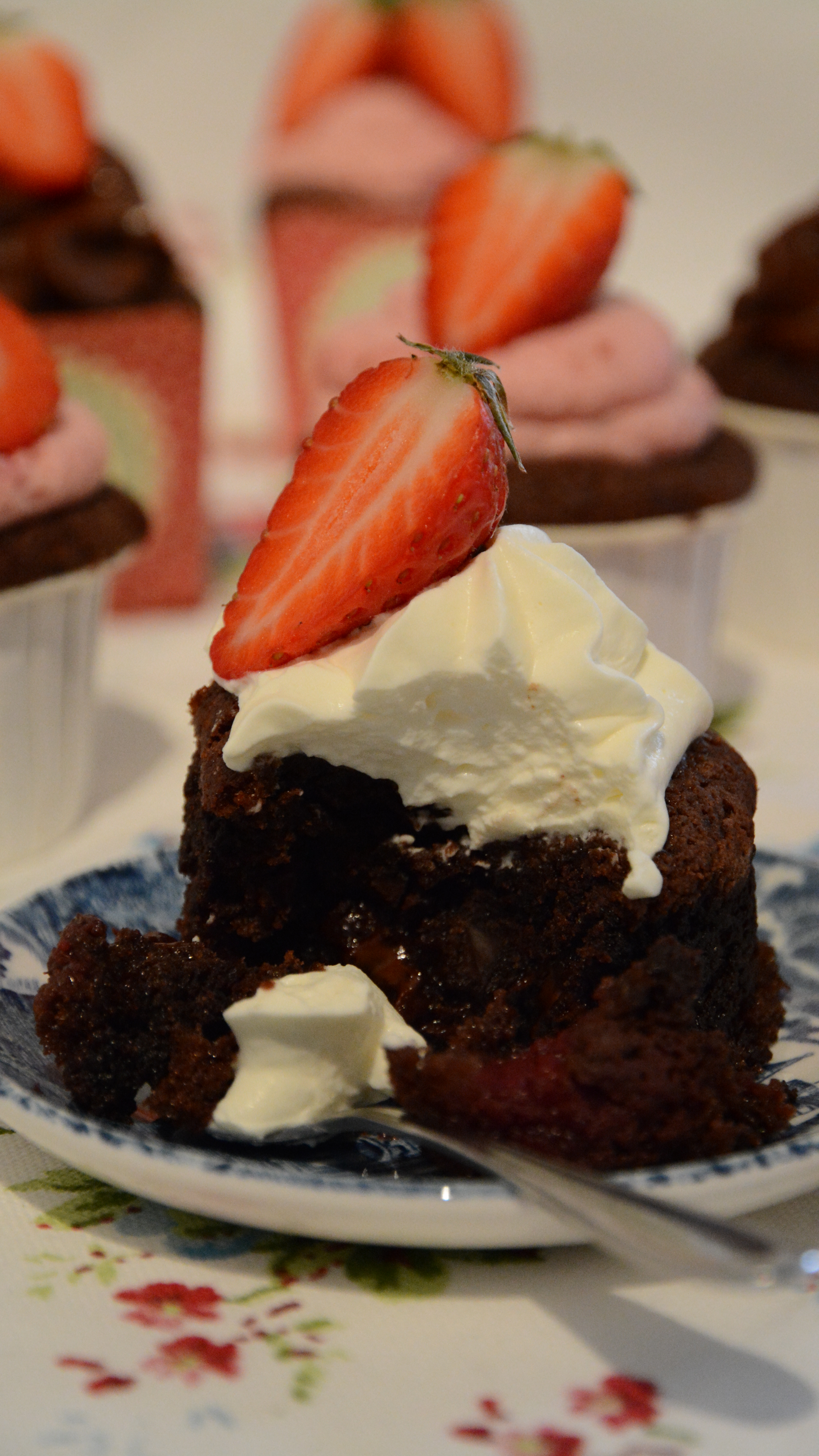 Chokladiga cupcakes med en inbakad överraskning av hallon och Nutella smakar som en dröm. Lika goda kalla med en klick vispad grädde, varma med en kula vaniljgräddglass som rumstempererade med frosting.