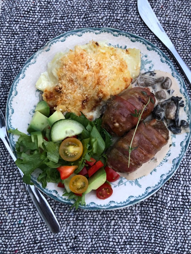 Baconlindade färsbiffar med potatisgratäng och svampsås med Cognac