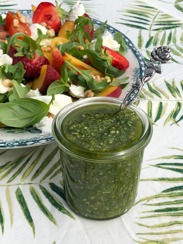 Mitt trick för en god pesto är att bara röra ner oljan och inte mixa ner den. Mixad olivolja kan nämligen upplevas lite besk. Dessutom blandar jag olivolja med rapsolja för en mjukare ton. Servera gärna peston till en sallad av ruccola, buffelmozzarella, tomater, nektariner, bär, basilika och rostade pinjenötter. Det blir ett prima grilltillbehör!