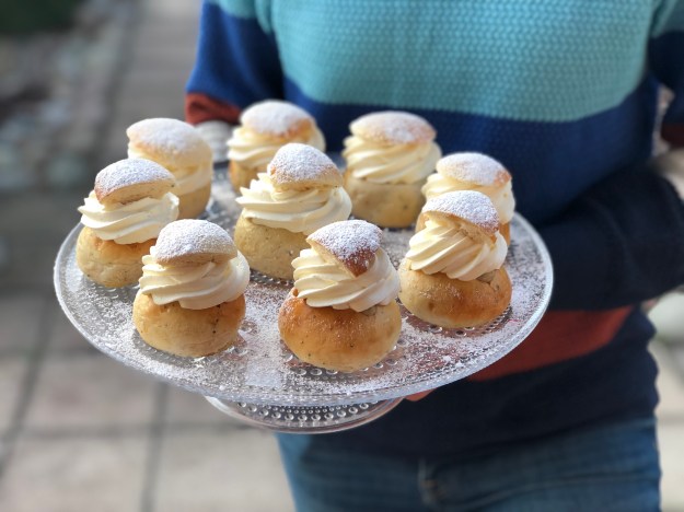 Klipp upp ett trekantigt lock på bullarna eller skär av ett runt lock. Gröp ev ur bullarna lite och fyll dem med mandelmassa. Vispa grädden tillsammans med lite vaniljsocker och spritsa ut grädden över fyllningen. Lägg på locken och pudra med florsocker. Klara att servera!