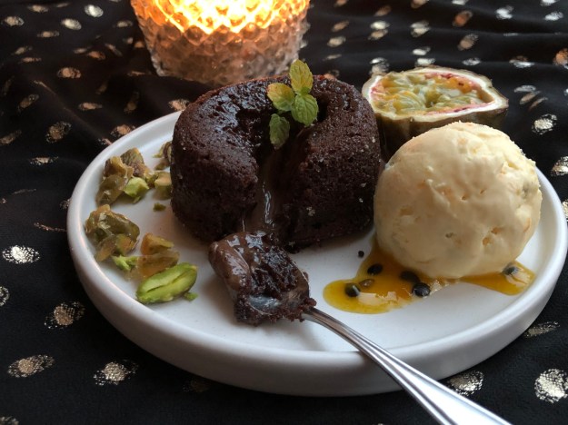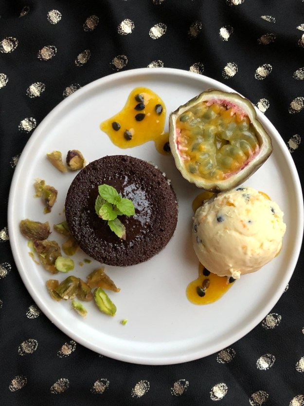 Chokladfondant med passionsglass, passionssås & kanderade pistagenötter