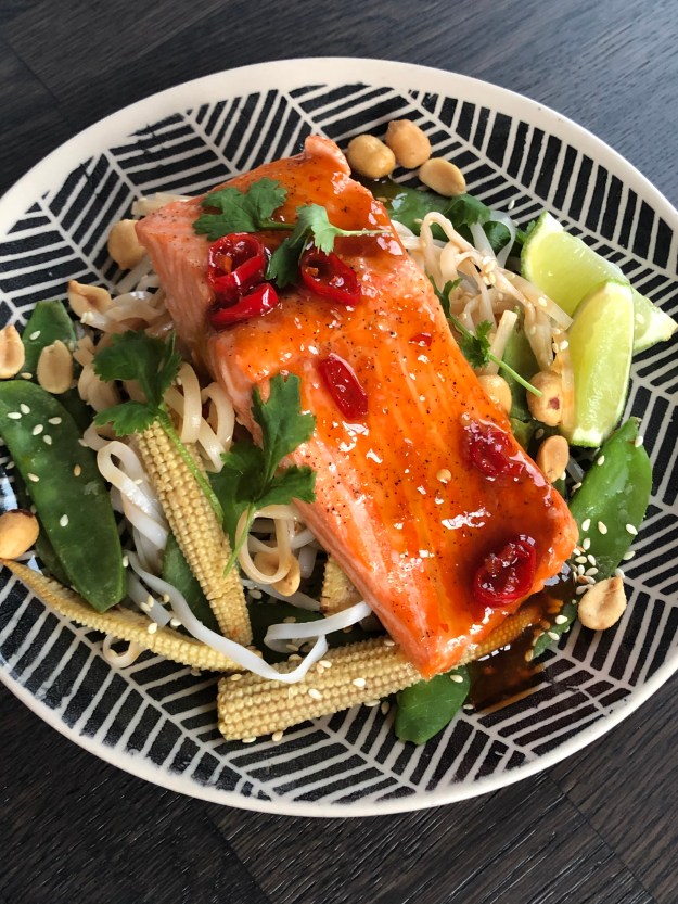 Teriayaki- ingefära- & chiliglaserad lax med nudlar