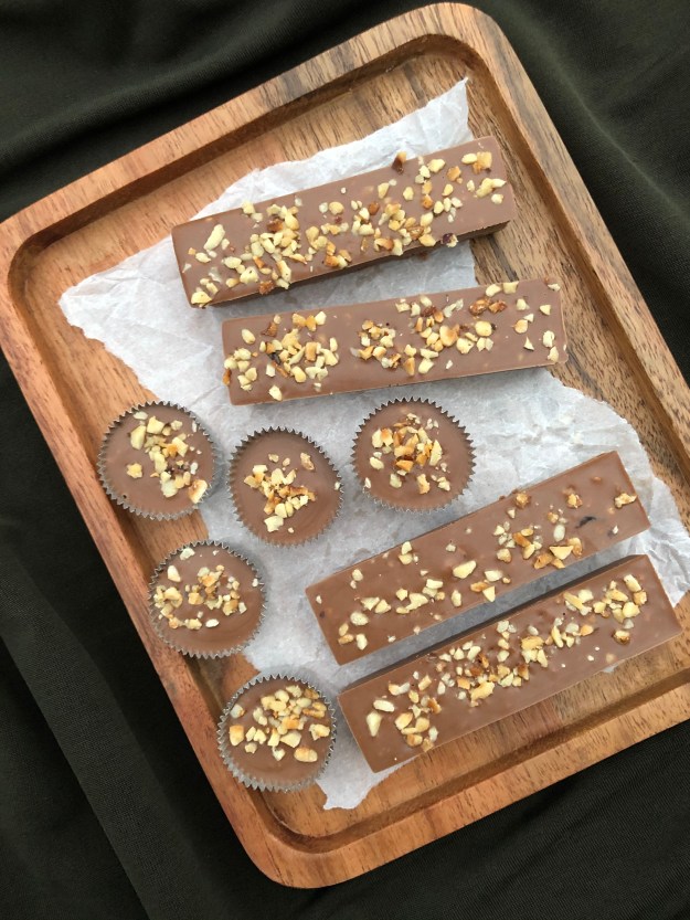 Finhacka chokladen och lägg i en bunke tillsammans med nougaten. Smält i mikron under kortare intervaller. Rör ner hasselnötskrosset och häll upp i valfria formar, garnera med lite hasselnötskross även på toppen. Låt stelna i kylen.