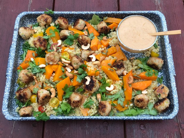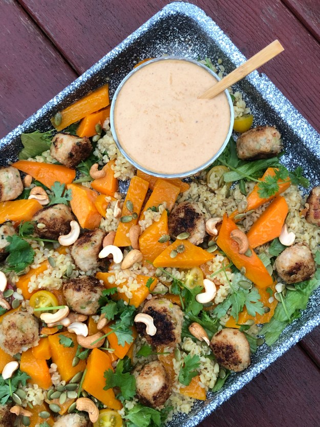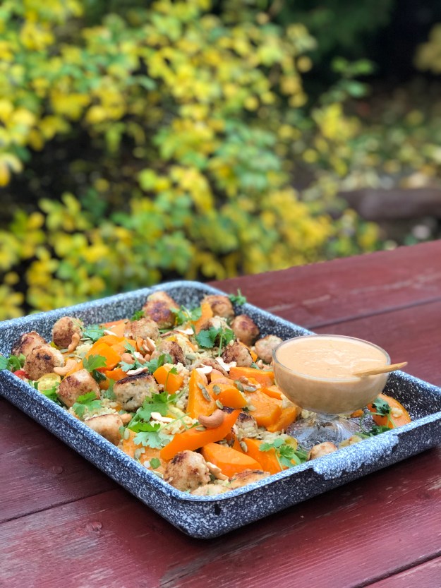 Kycklingbollar, rostad pumpa och ingefäradressing med cashewnötter