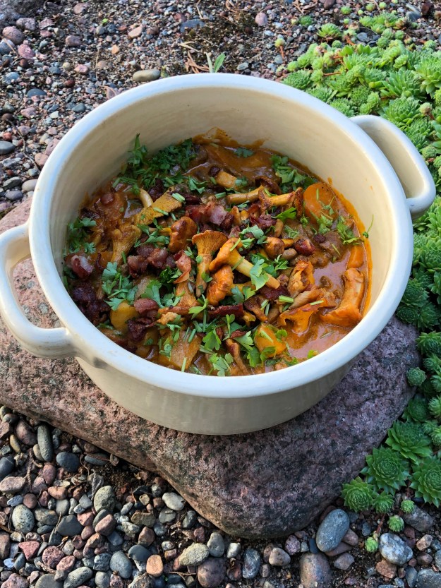 Det är så enkelt att lyxa till en sådan här gryta med både bacon, kantareller och färsk persilja.