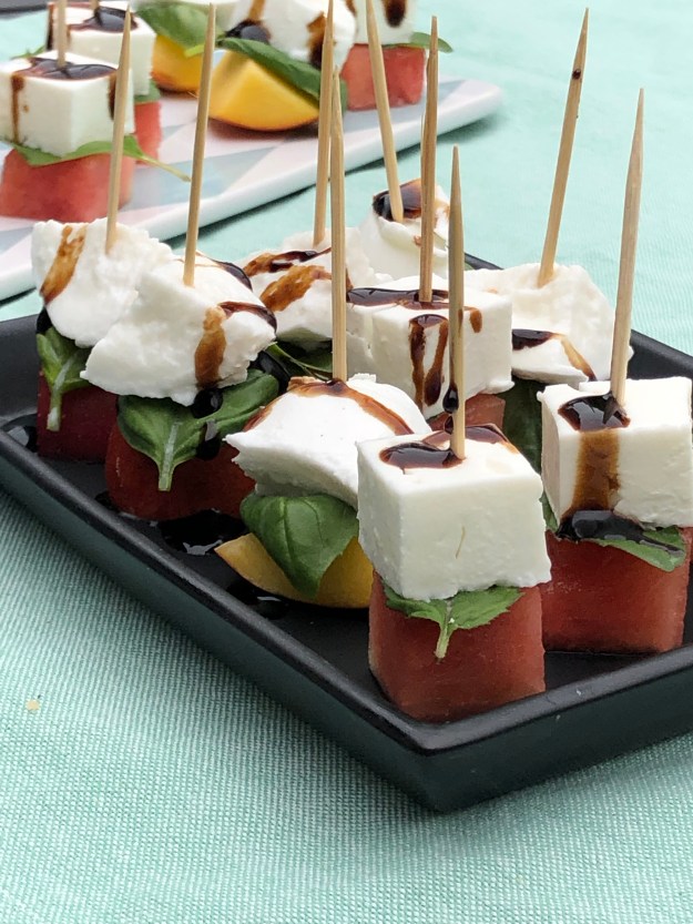 Skär kuber av frukt och ost. (Låt mozzarellan rinna av/torka den lätt). Stapla på varandra med grönt emellan. Stick ner en cocktailpinne. Ringla över balsamico precis innan servering.