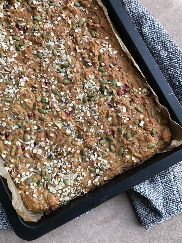 Blanda de blöta ingredienserna för sig och de torra för sig. Vänd sedan ihop allting till en kletig smet. Klä en ugnsform (ca 25 cm x 39 cm) med bakplåtspapper och fördela smeten i formen. Strö över lite havregryn och frön och grädda brödet i nedre delen av ugnen i ca 30 minuter el tills en sticka kommer upp torr. Låt svalna helt. Skär i rutor och dela rutorna. Fyll med pålägg!