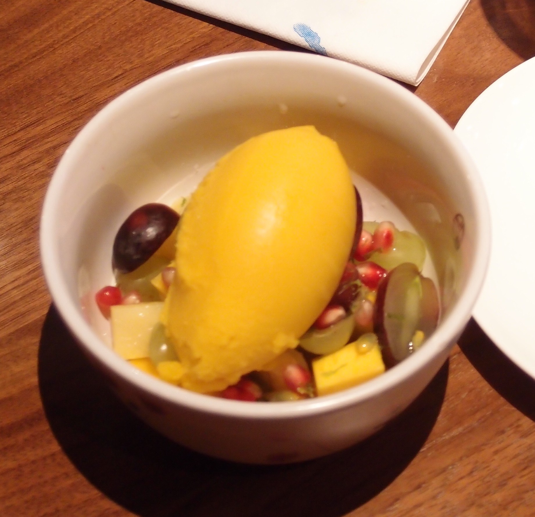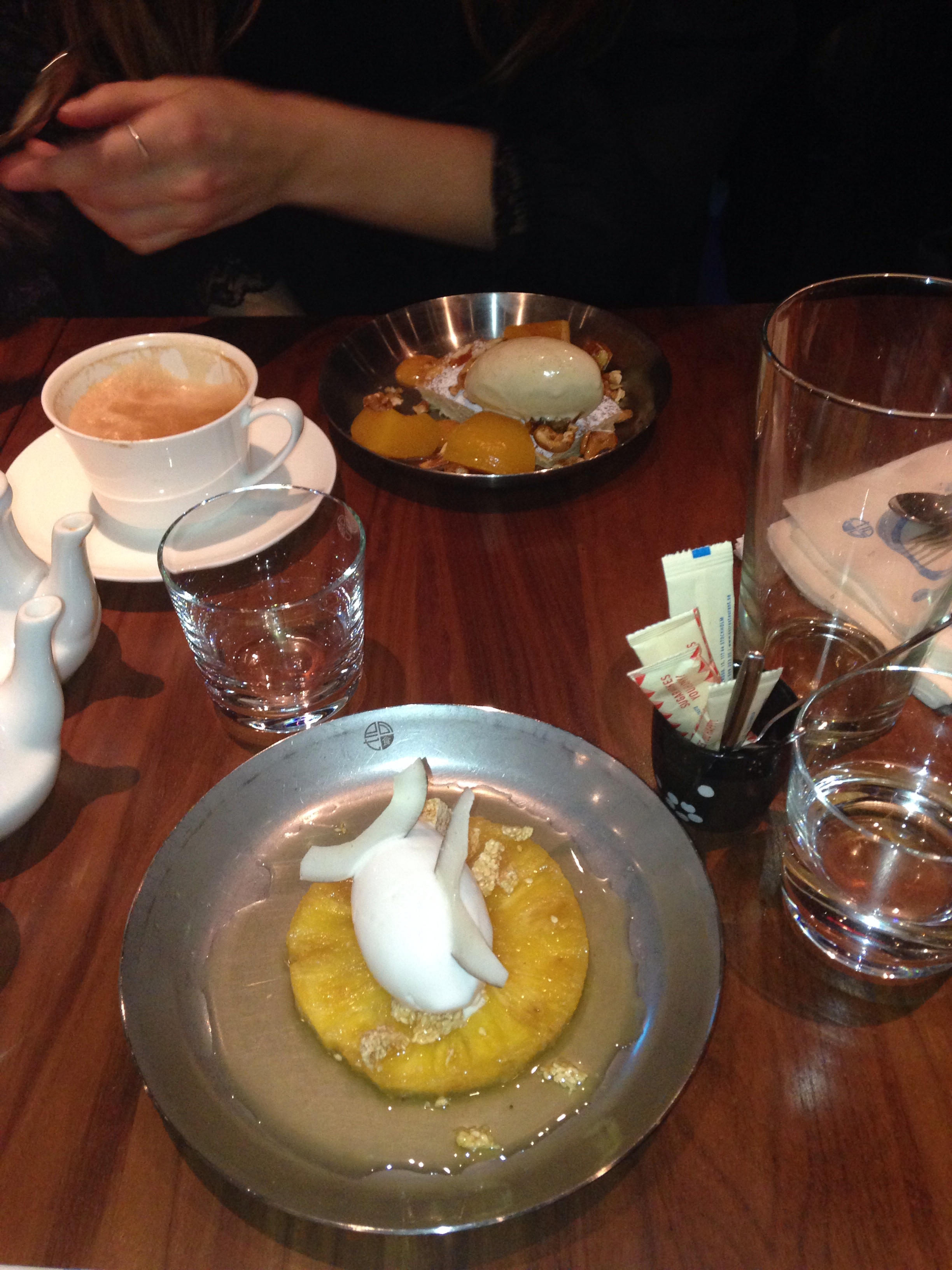 Persikotarte med mustig kola- och cashewglass samt en fräsch karamelliserad ananas med kokosmjölkglass som serverades med (ett segkletigt) ångat sötris och russin (som inte var min melodi). Nedan fruktsallad med en ruggigt god och krämig lime- och mangsorbet!