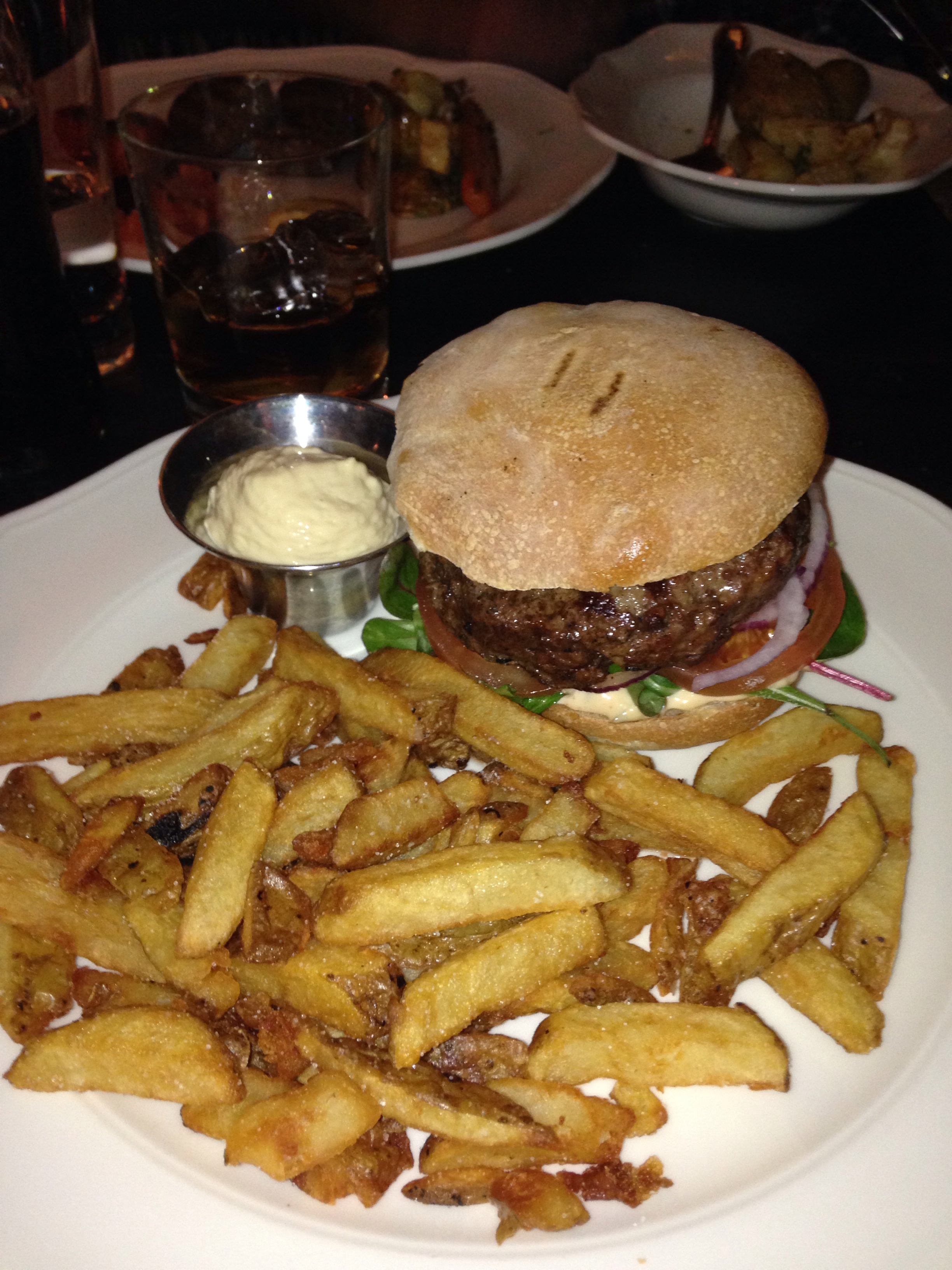 Tyvärr, måste jag säga blev besöket lite av en besvikelse. Väntetiden var ca 45 minuter (det går inte att boka bord) och väntetiden på maten ytterligare runt 20-30 minuter. Vi som inte hade ätit på 6 timmar darrade ju nästan av hunger. (Helt vårt eget fel dock!). När sedan beställningen kommer in och är fel blir man ju inte på bättre humör direkt. Men det tråkigaste var ändå att man inte fick göra ändringar i menyn, bara plocka bort något man inte vill ha eller tål. Vad är det för service? (Jag ville bara byta ut en ost mot en annan). Min burgare blev således torr och tråkig trots att brödet var gott och köttet likaså. Jag föredrar burgare fullproppad med grönsaker och dressing för att maxa smakerna men det ingick alltså inte. Tror dock att en äkta burgare ska vara lite sparmakad!  Shoestring fries var ett kul inslag men de smakade som chips ungefär och blev lite tråkiga och flottiga i längden.