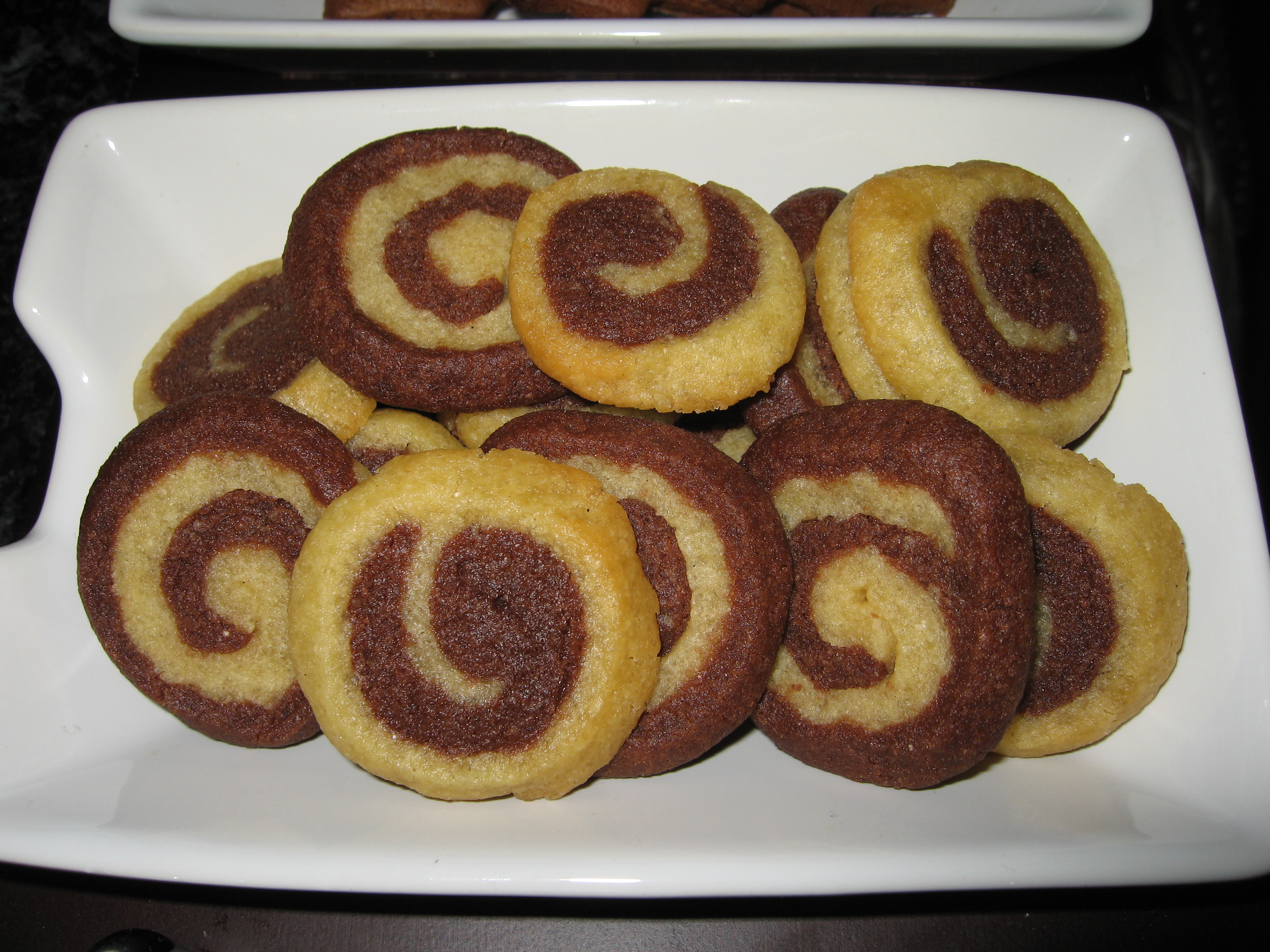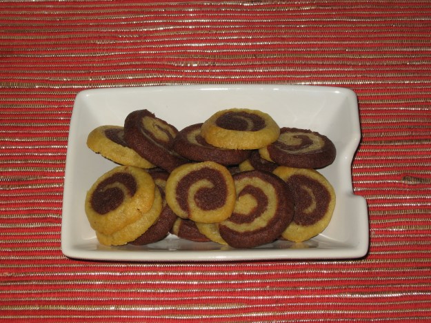 *Man kavlar ut en ljus och en mörk deg till en varsin rektangel. Sen lägger man dem ovanpå varandra och rullar ihop, som en rulltårta. Rullen skär man i skivor med en vass kniv och lägger på plåt för att gräddas. Om rullen känns mjuk kan man frysa in den tills den blir hård, då är det lättare att skära snygga runda skivor*.